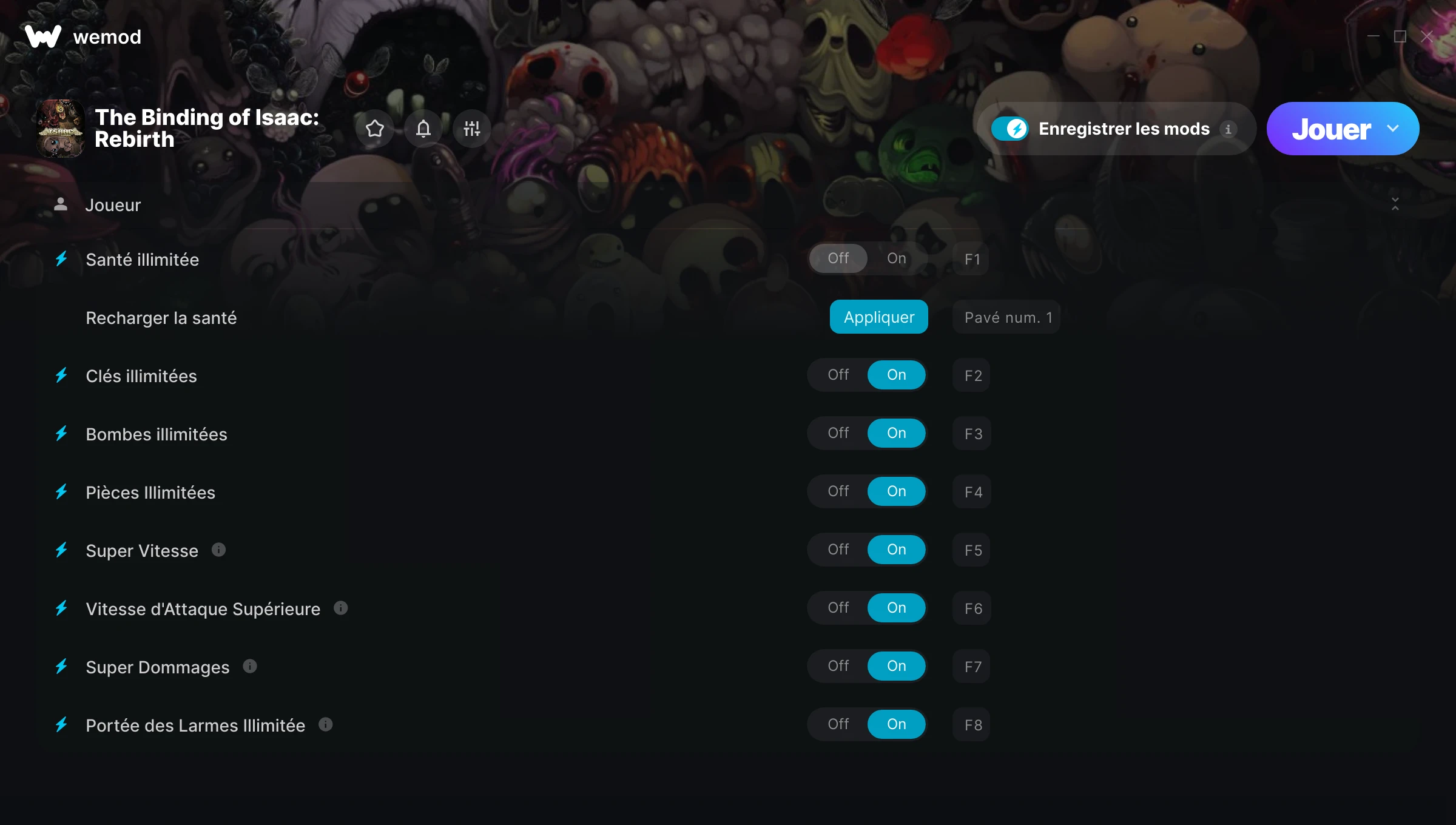 its funky i have to load the game through steam wait till is fully opens then press play in wemod. the health works and items. the damage and speed and tears works when i press escape when im in a game.