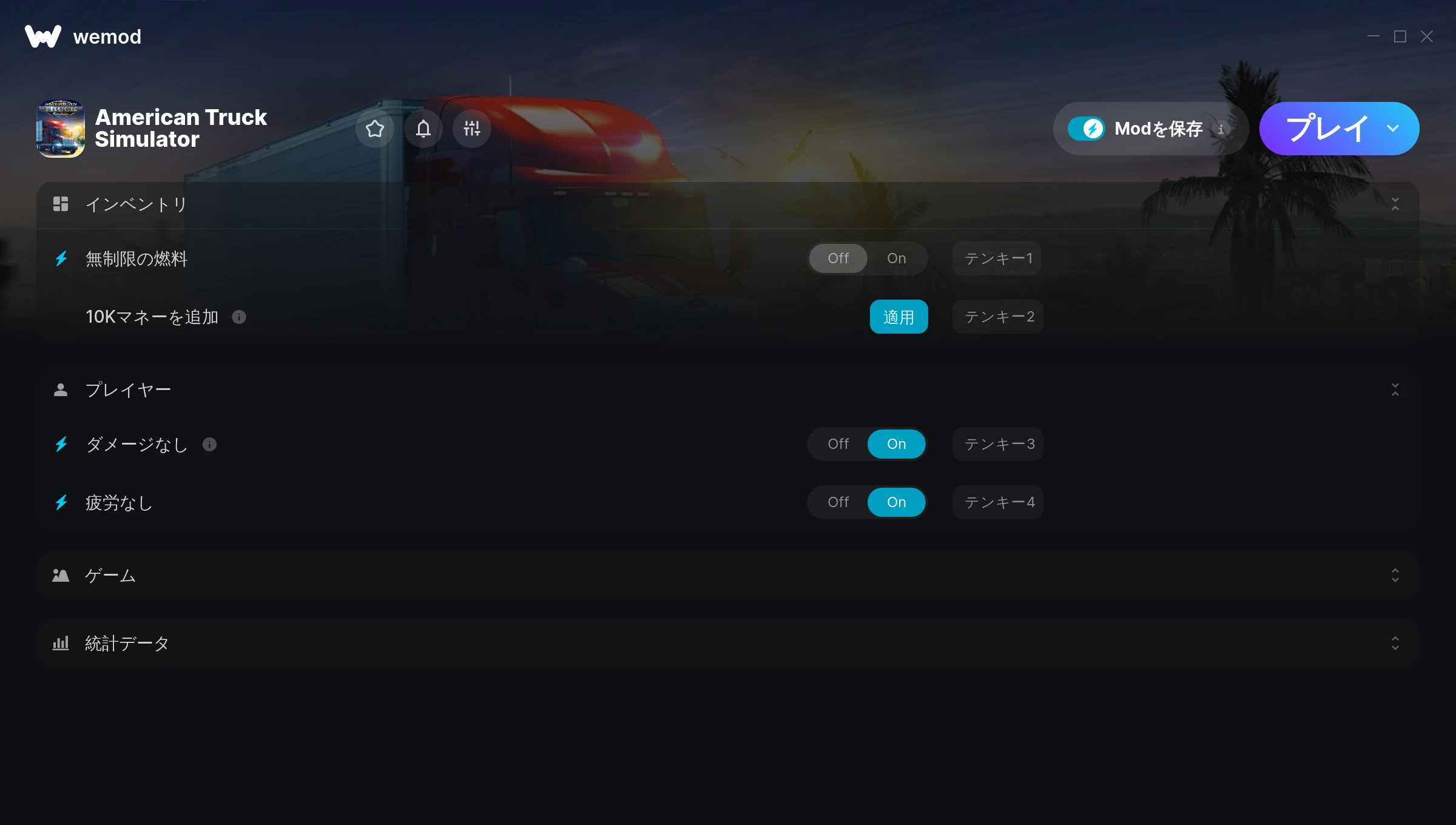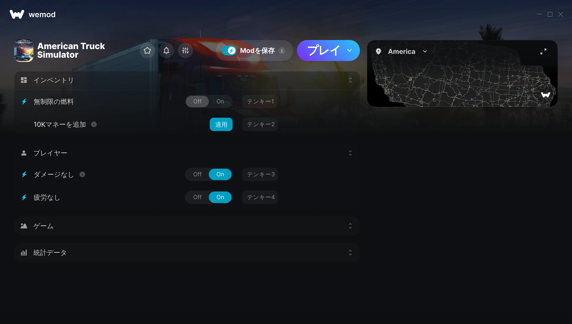 Thank you for the awesome mods! the no damage + fatigue HELPED ME ALOT! i spent the whole day using wemod for american truck simulator!