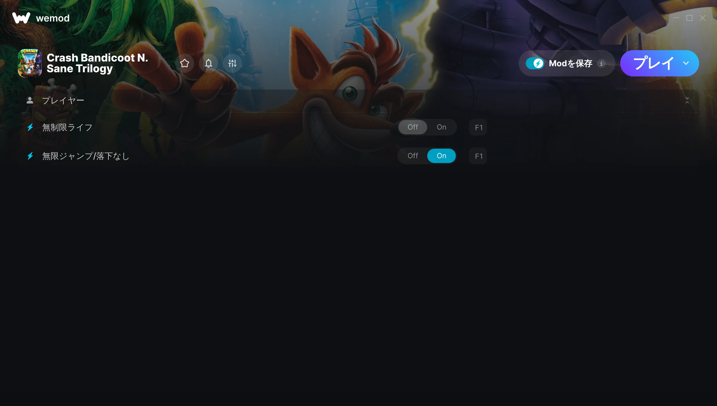 85MB Windows ...またはPCでWeModにアクセスしてアプリをダウンロード 無制限ライフを入手, 無限ジャンプ/落下なし for Crash Bandicoot N. Sane Trilogy with WeMod