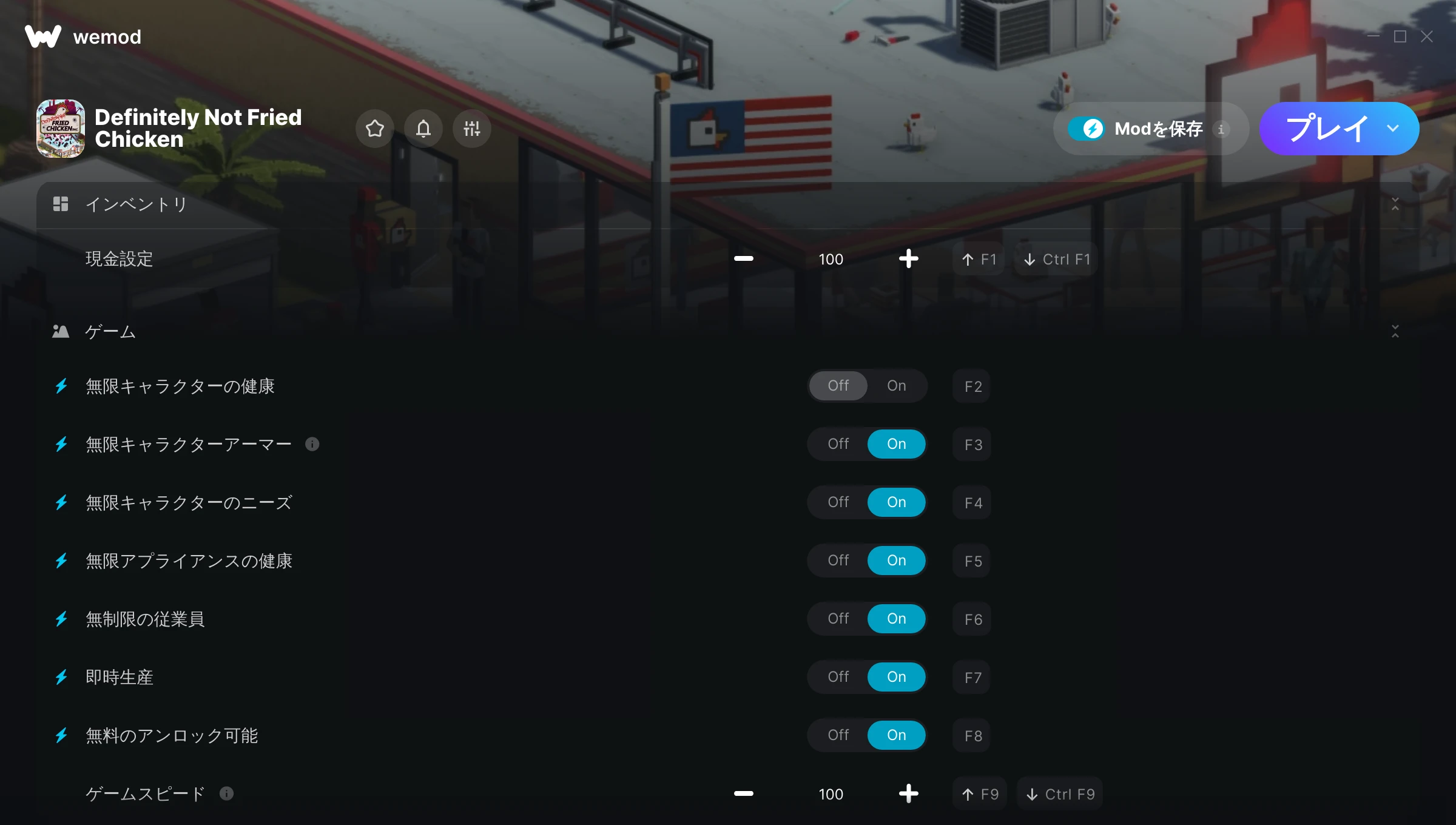 85MB Windows ...またはPCでWeModにアクセスしてアプリをダウンロード 現金設定を入手, 無限キャラクターの健康 & その他7件のMod for Definitely Not Fried Chicken with WeMod