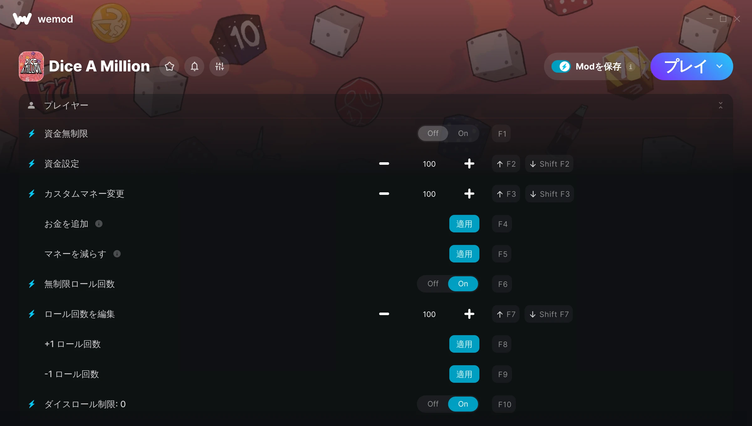 Dice A Millionでチートを使うにはどうすればよいですか?WeModはすべてのゲームをPC上に安全に表現します。リストからゲームを開き、プレイを開始するだけです。ゲームが読み込まれ、ユーザーがゲーム内に入ると、さまざまなチートを有効化できるようになります!これは私のゲームのバージョンで動作しますか?WeModは高度な技術を使用して、実行中のゲームのバージョンを検知し、対応しているかどうかをユーザーに通知します。通知がなくても試してみることができますが、その場合はアップデートをリクエストしてみてください!