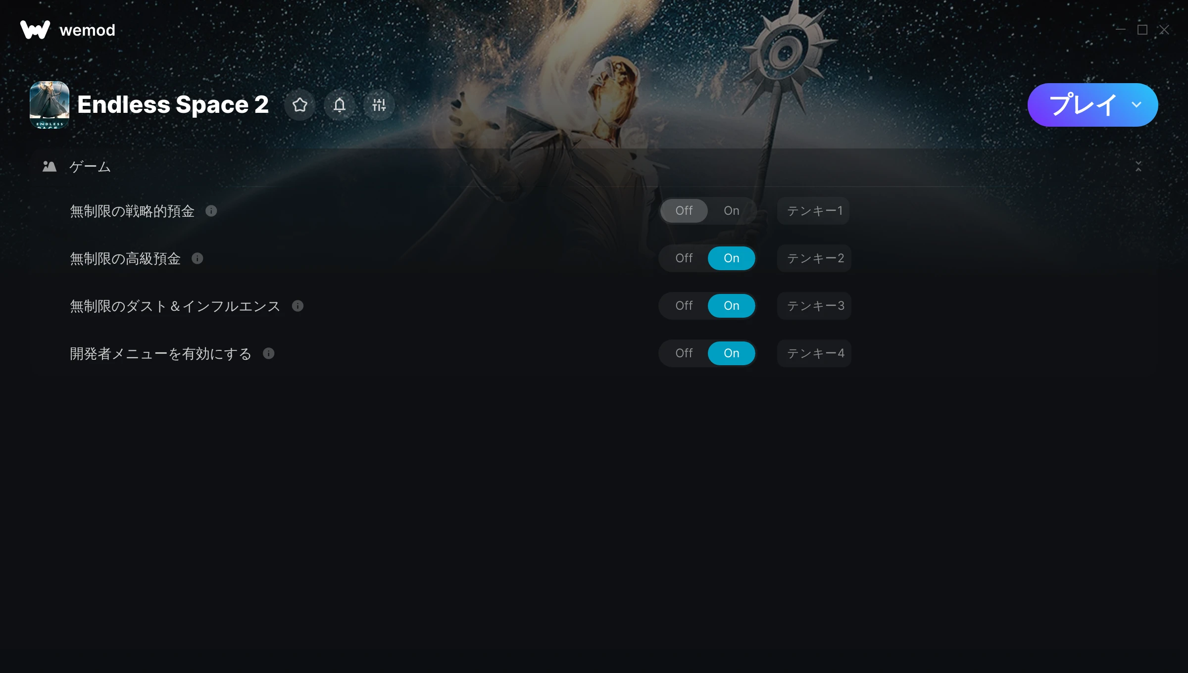 85MB Windows ...またはPCでWeModにアクセスしてアプリをダウンロード 無制限の戦略的預金を入手, 無制限の高級預金 & その他2件のMod for Endless Space 2 with WeMod