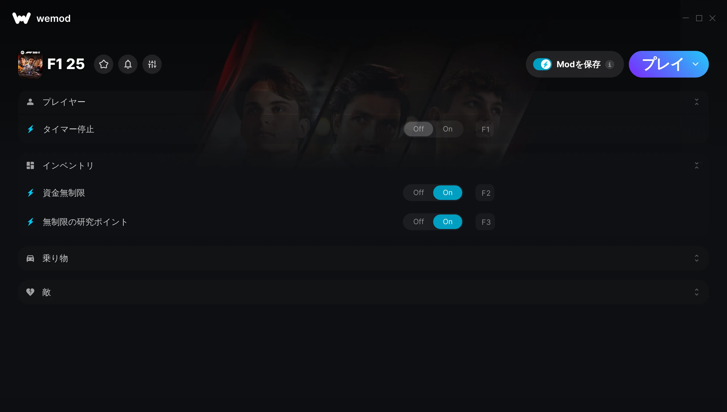 F1 25でチートを使うにはどうすればよいですか?WeModはすべてのゲームをPC上に安全に表現します。リストからゲームを開き、プレイを開始するだけです。ゲームが読み込まれ、ユーザーがゲーム内に入ると、さまざまなチートを有効化できるようになります!これは私のゲームのバージョンで動作しますか?WeModは高度な技術を使用して、実行中のゲームのバージョンを検知し、対応しているかどうかをユーザーに通知します。通知がなくても試してみることができますが、その場合はアップデートをリクエストしてみてください!