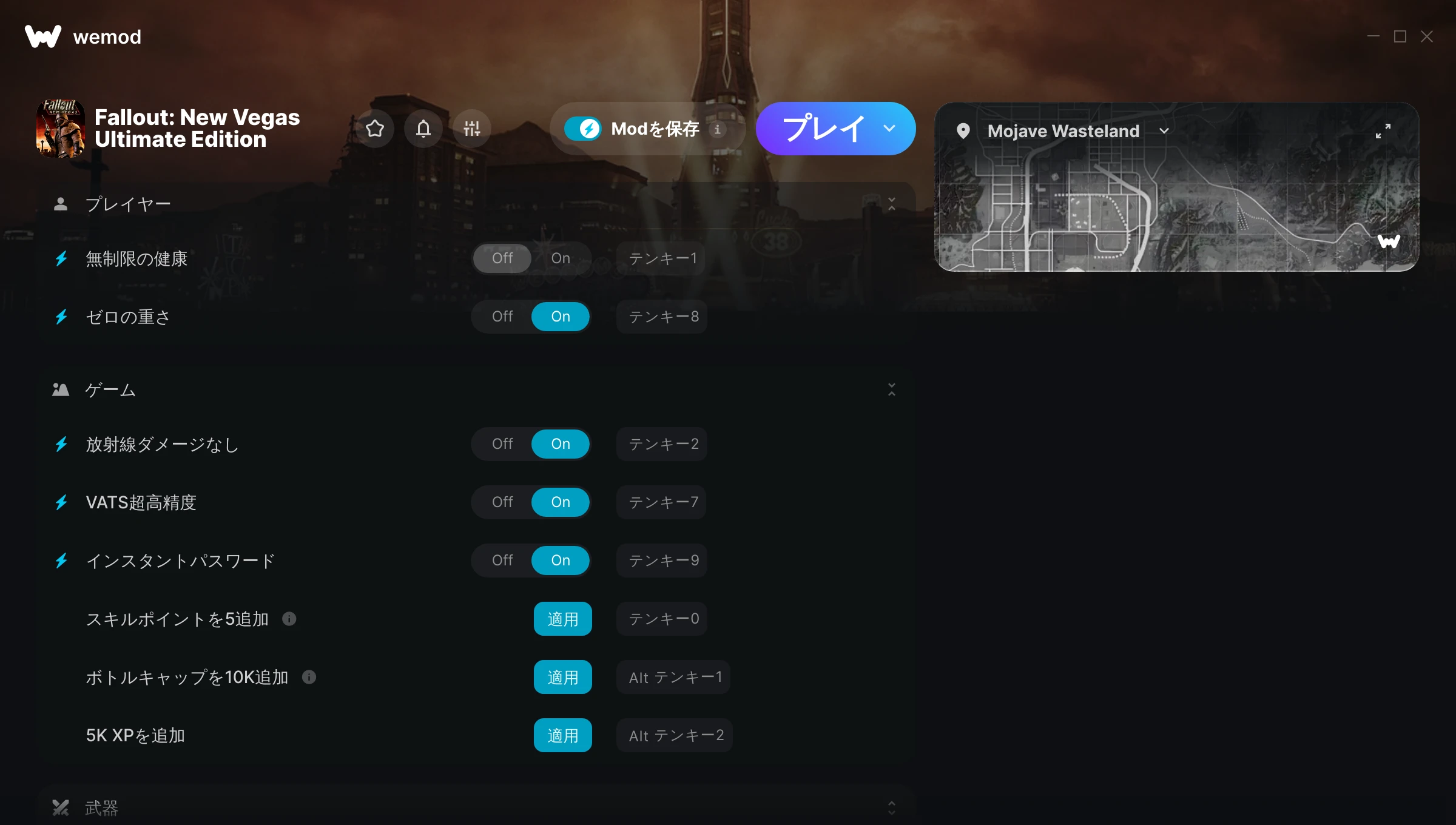 mods work, the game did crash, but that honestly is probably new vegas's fault not WeMod. Nice to have some more pocket change.
