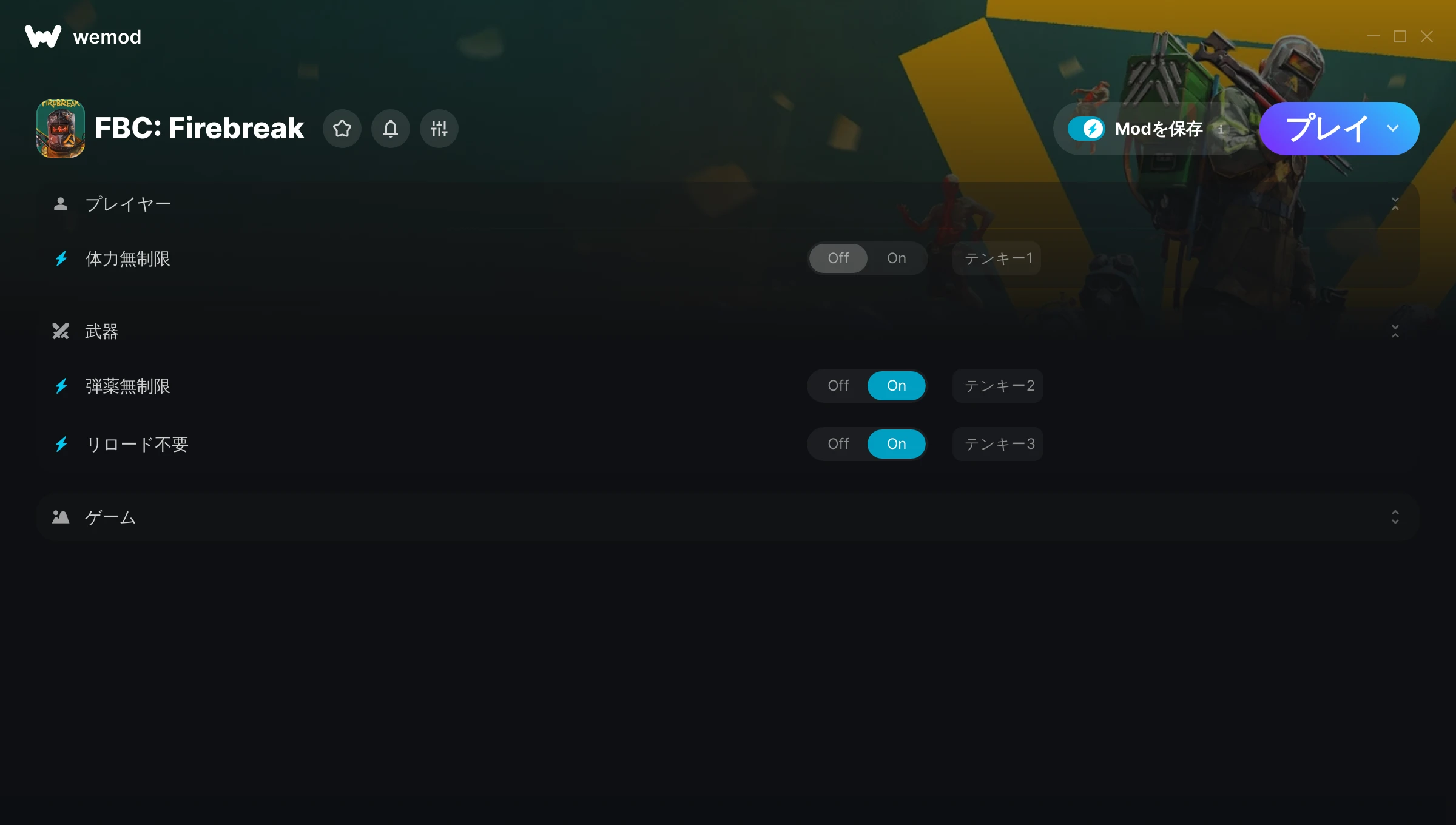 85MB Windows ...またはPCでWeModにアクセスしてアプリをダウンロード 体力無制限を入手, 弾薬無制限 & その他2件のMod for FBC: Firebreak with WeMod