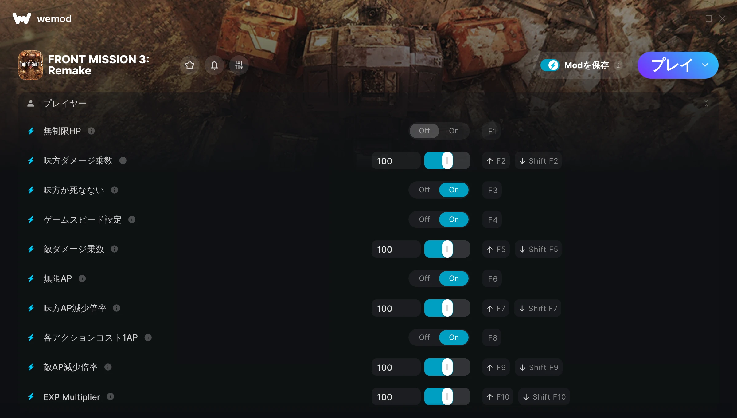 FRONT MISSION 3: Remakeでチートを使うにはどうすればよいですか?WeModはすべてのゲームをPC上に安全に表現します。リストからゲームを開き、プレイを開始するだけです。ゲームが読み込まれ、ユーザーがゲーム内に入ると、さまざまなチートを有効化できるようになります!これは私のゲームのバージョンで動作しますか?WeModは高度な技術を使用して、実行中のゲームのバージョンを検知し、対応しているかどうかをユーザーに通知します。通知がなくても試してみることができますが、その場合はアップデートをリクエストしてみてください!