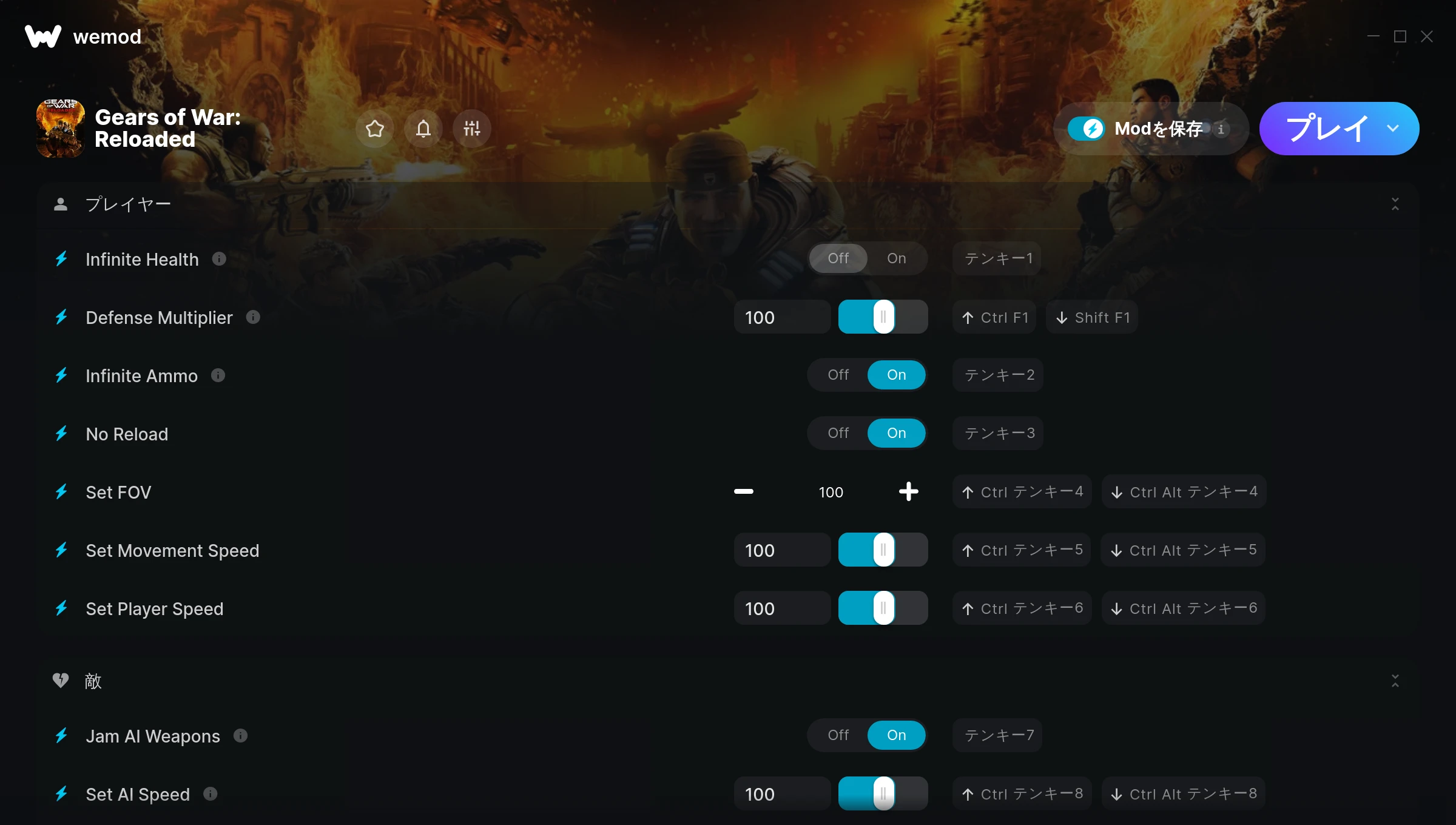 85MB Windows ...またはPCでWeModにアクセスしてアプリをダウンロード 体力無限を入手, 防御乗数 & その他10件のMod for Gears of War: Reloaded with WeMod