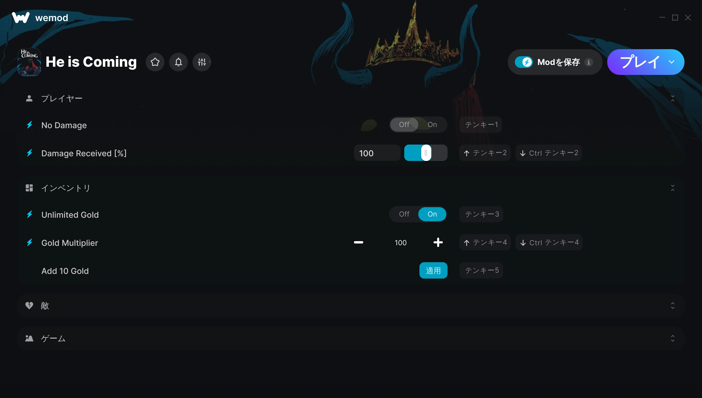 He is Comingでチートを使うにはどうすればよいですか?WeModはすべてのゲームをPC上に安全に表現します。リストからゲームを開き、プレイを開始するだけです。ゲームが読み込まれ、ユーザーがゲーム内に入ると、さまざまなチートを有効化できるようになります!これは私のゲームのバージョンで動作しますか?WeModは高度な技術を使用して、実行中のゲームのバージョンを検知し、対応しているかどうかをユーザーに通知します。通知がなくても試してみることができますが、その場合はアップデートをリクエストしてみてください!