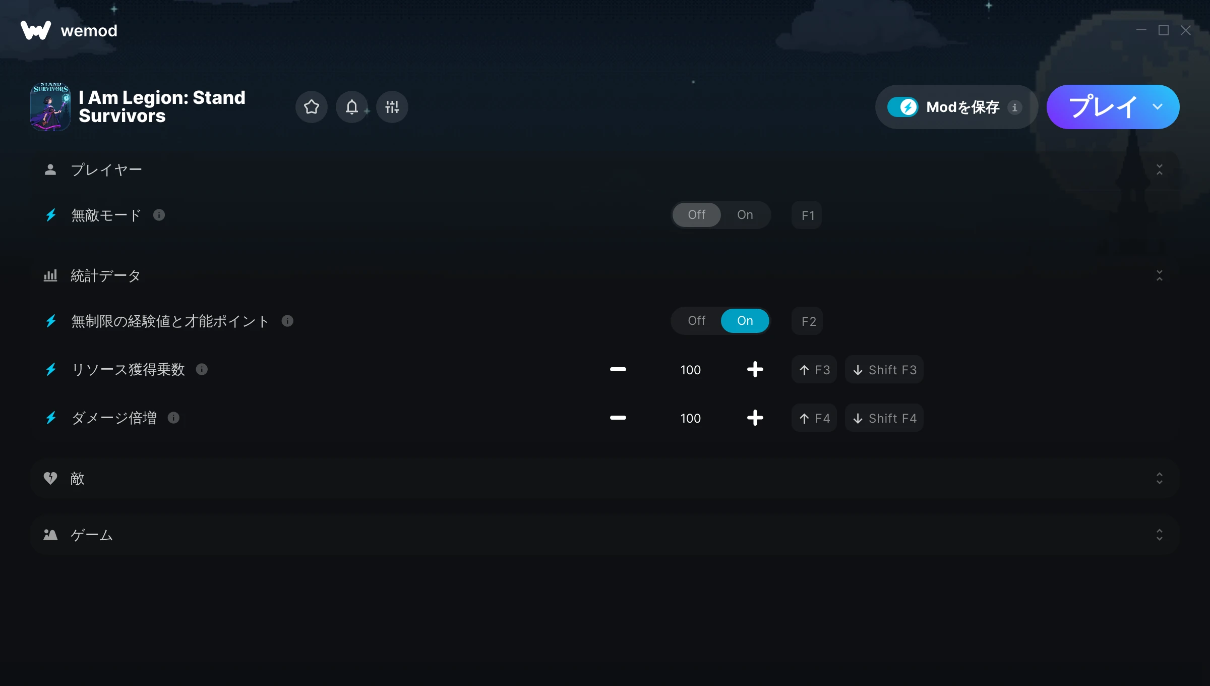 I Am Legion: Stand Survivorsでチートを使うにはどうすればよいですか?WeModはすべてのゲームをPC上に安全に表現します。リストからゲームを開き、プレイを開始するだけです。ゲームが読み込まれ、ユーザーがゲーム内に入ると、さまざまなチートを有効化できるようになります!これは私のゲームのバージョンで動作しますか?WeModは高度な技術を使用して、実行中のゲームのバージョンを検知し、対応しているかどうかをユーザーに通知します。通知がなくても試してみることができますが、その場合はアップデートをリクエストしてみてください!