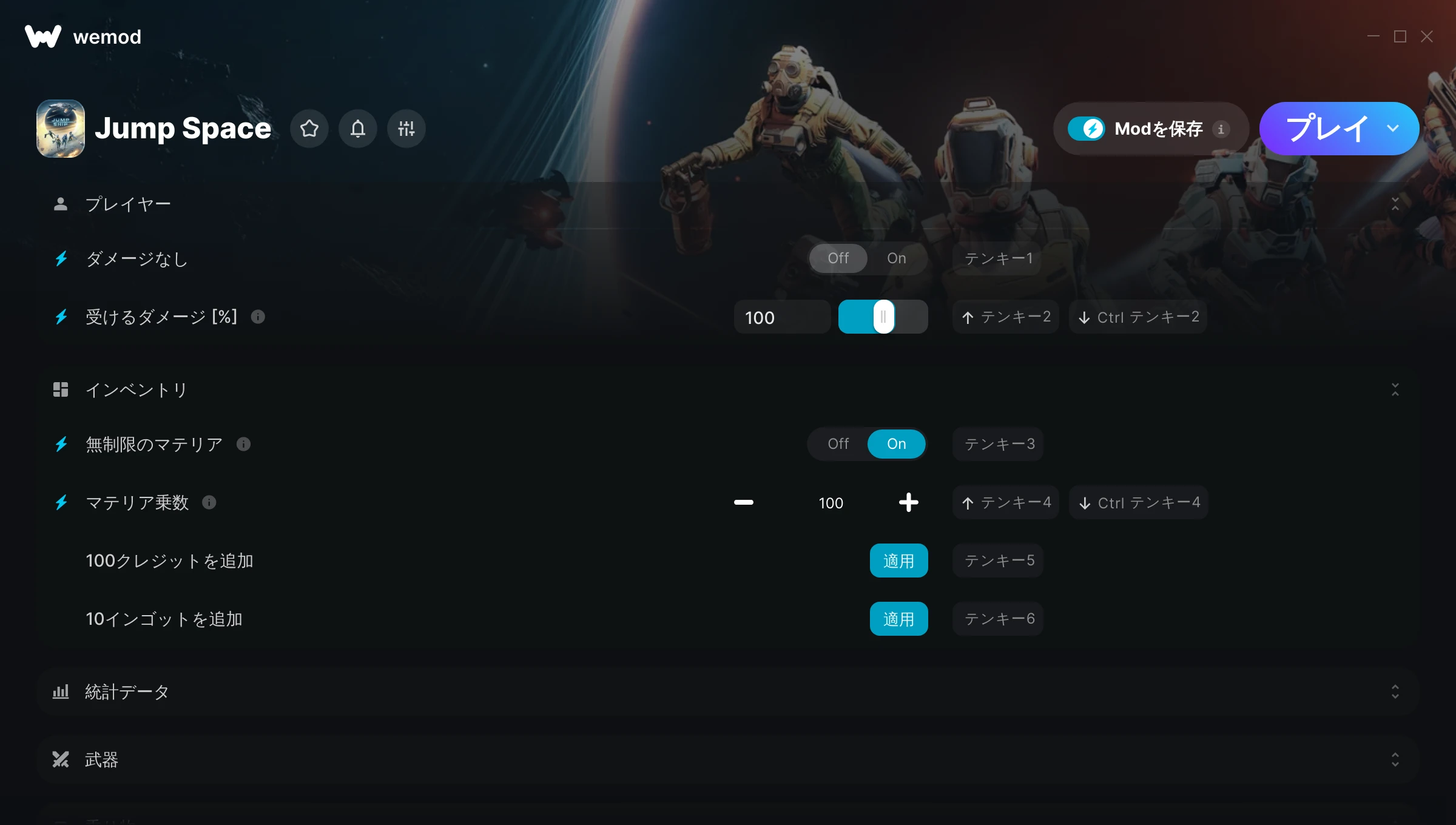 85MB Windows ...またはPCでWeModにアクセスしてアプリをダウンロード ダメージなしを入手, 受けるダメージ [%] & その他19件のMod for Jump Space with WeMod