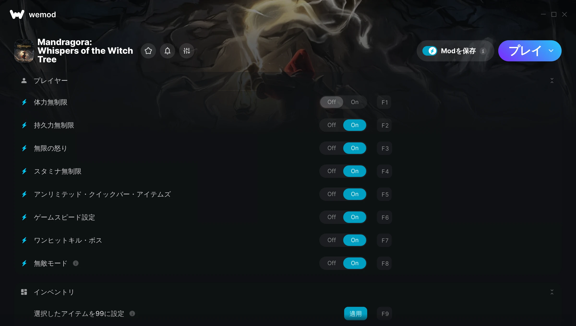Mandragora: Whispers of the Witch Treeでチートを使うにはどうすればよいですか?WeModはすべてのゲームをPC上に安全に表現します。リストからゲームを開き、プレイを開始するだけです。ゲームが読み込まれ、ユーザーがゲーム内に入ると、さまざまなチートを有効化できるようになります!これは私のゲームのバージョンで動作しますか?WeModは高度な技術を使用して、実行中のゲームのバージョンを検知し、対応しているかどうかをユーザーに通知します。通知がなくても試してみることができますが、その場合はアップデートをリクエストしてみてください!