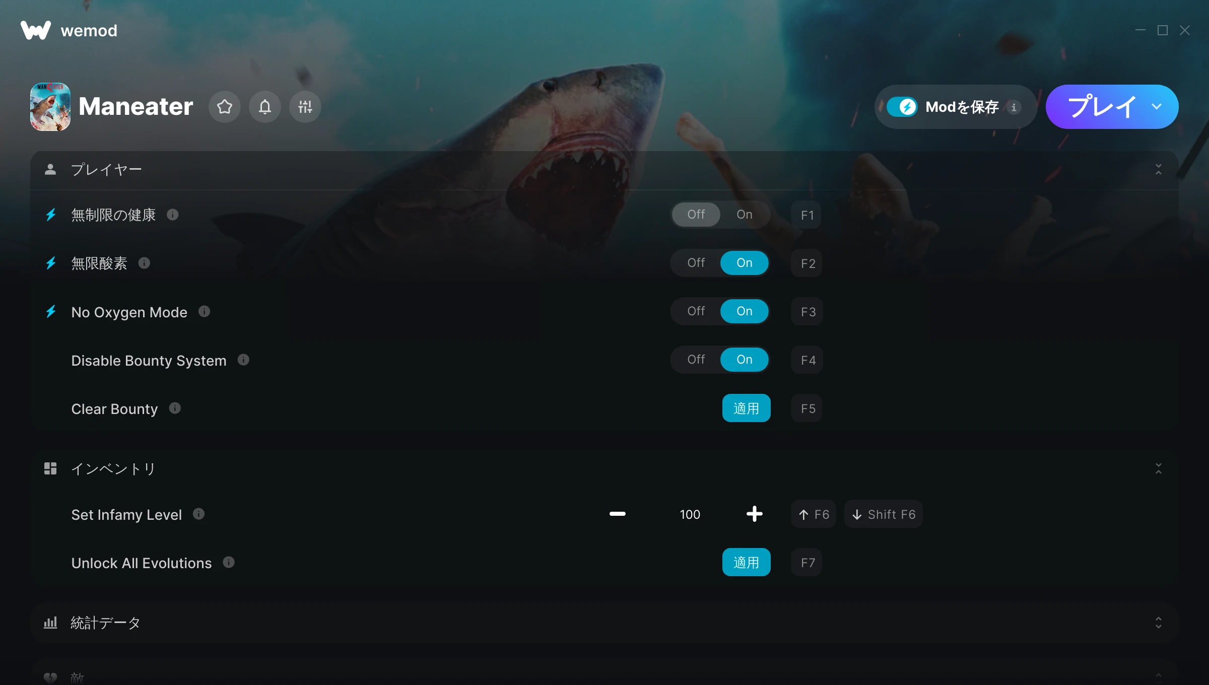 I am new to PC. so having to get all my old games back to where I was at is a painful and slow task sometimes. wemod is the perfect app for me to help with that. it also is increadibly fun on all the games ive played so far like walking zombie 2 and wolfenstein and now youve blown me away with maneater. truly impressive