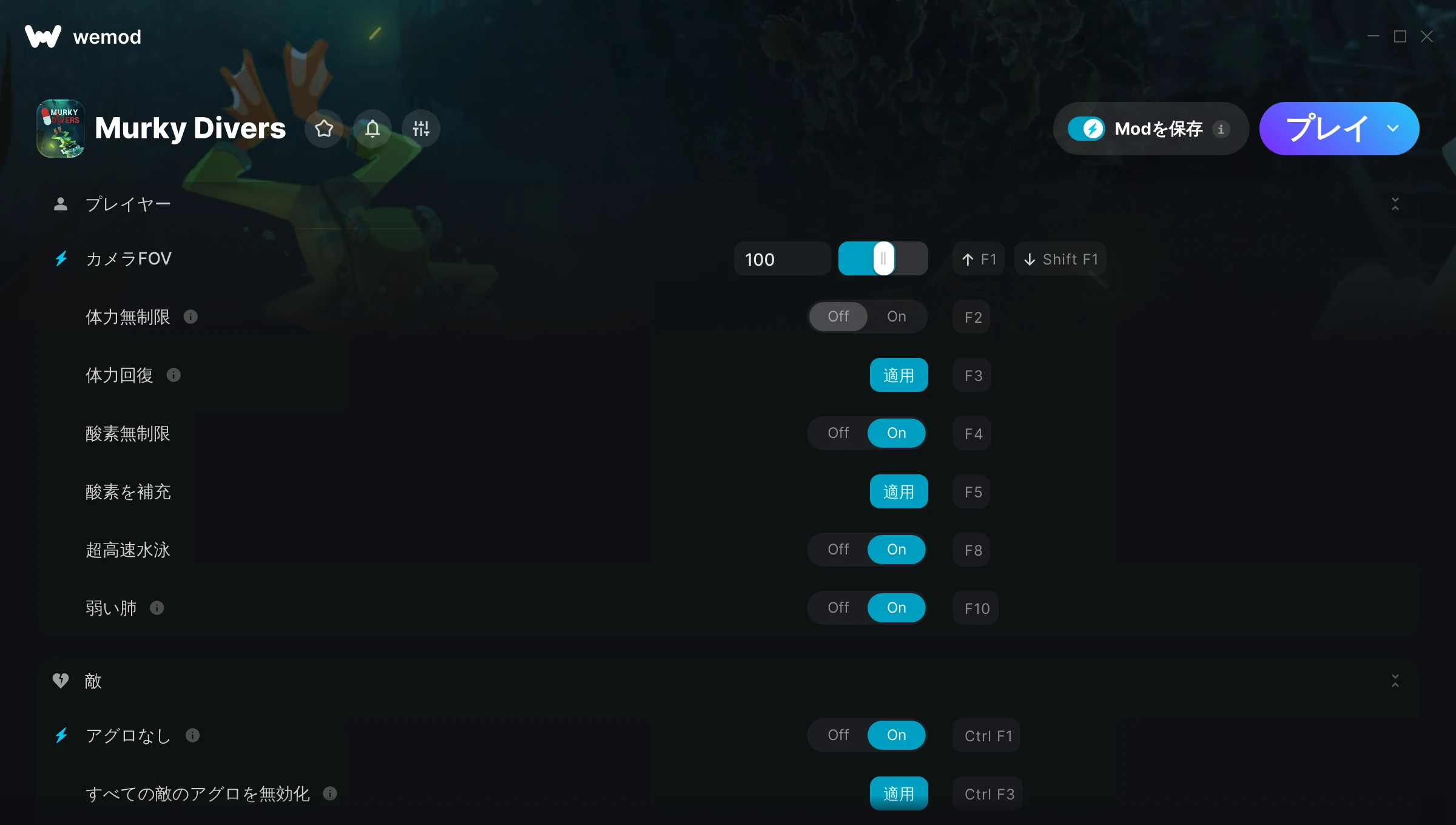 85MB Windows ...またはPCでWeModにアクセスしてアプリをダウンロード カメラFOVを入手, 体力無制限 & その他15件のMod for Murky Divers with WeMod