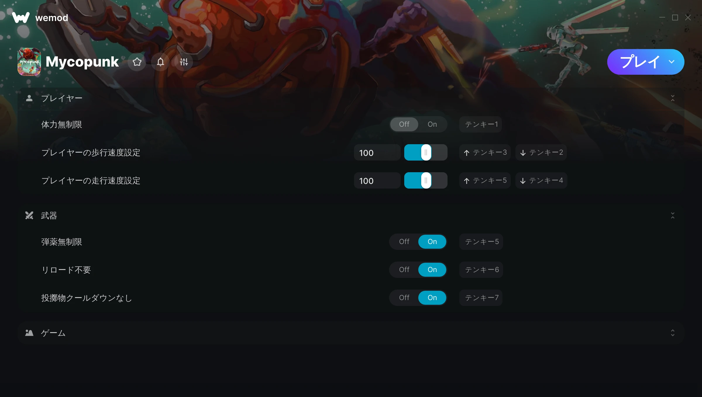 85MB Windows ...またはPCでWeModにアクセスしてアプリをダウンロード 体力無制限を入手, プレイヤーの歩行速度設定 & その他5件のMod for Mycopunk with WeMod