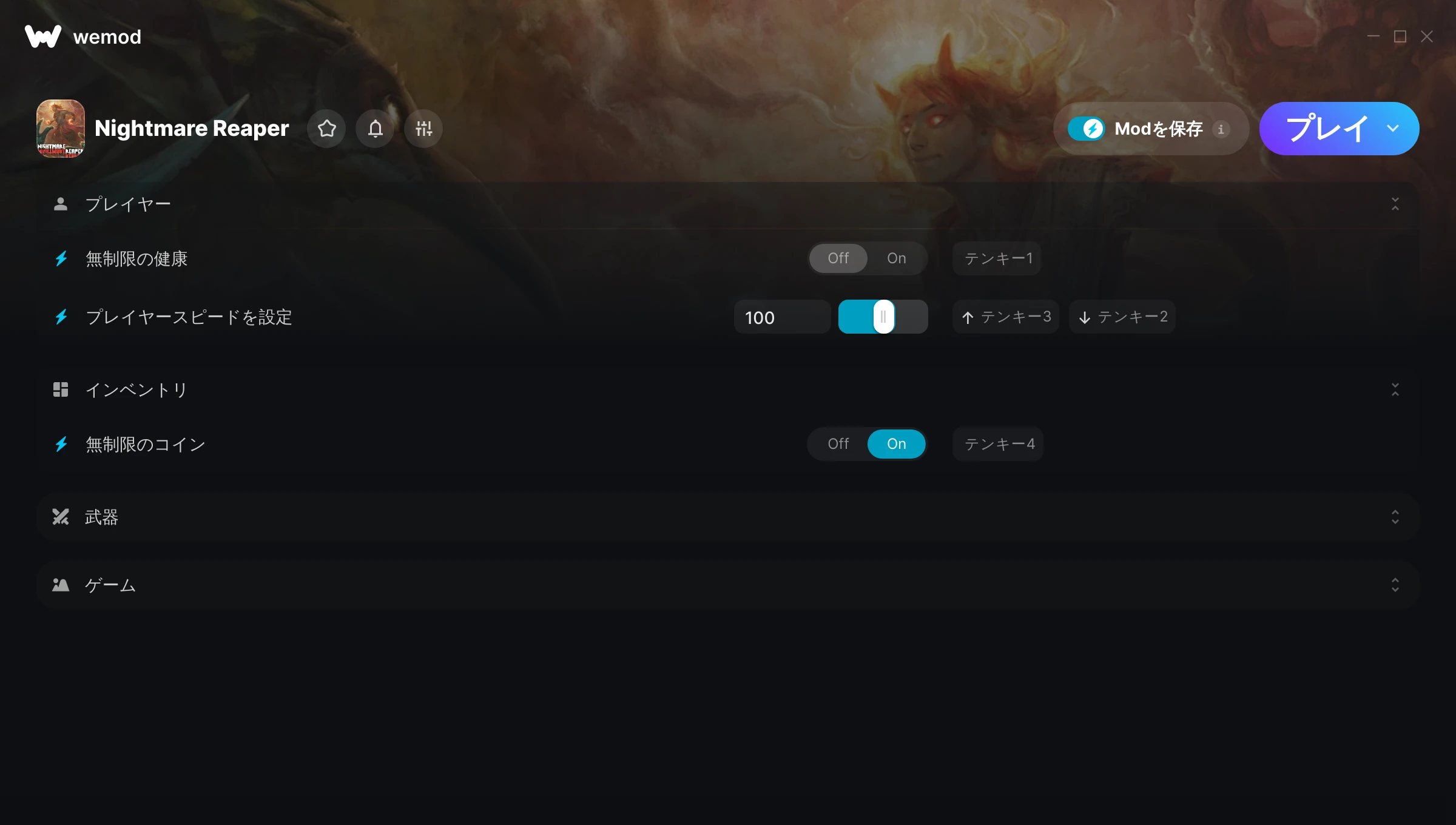 85MB Windows ...またはPCでWeModにアクセスしてアプリをダウンロード 無制限の健康を入手, プレイヤースピードを設定 & その他4件のMod for Nightmare Reaper with WeMod
