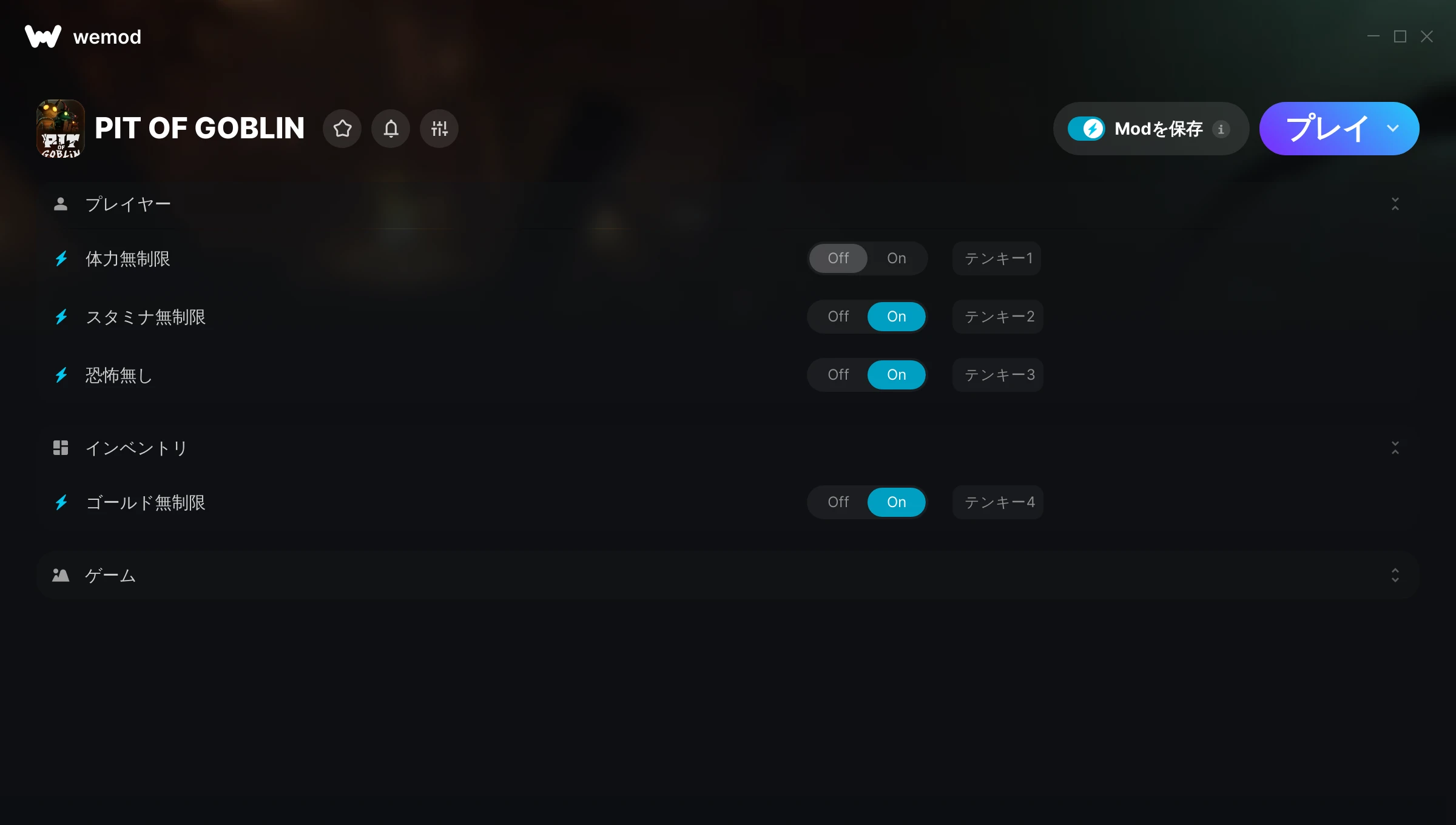 PIT OF GOBLINでチートを使うにはどうすればよいですか?WeModはすべてのゲームをPC上に安全に表現します。リストからゲームを開き、プレイを開始するだけです。ゲームが読み込まれ、ユーザーがゲーム内に入ると、さまざまなチートを有効化できるようになります!これは私のゲームのバージョンで動作しますか?WeModは高度な技術を使用して、実行中のゲームのバージョンを検知し、対応しているかどうかをユーザーに通知します。通知がなくても試してみることができますが、その場合はアップデートをリクエストしてみてください!
