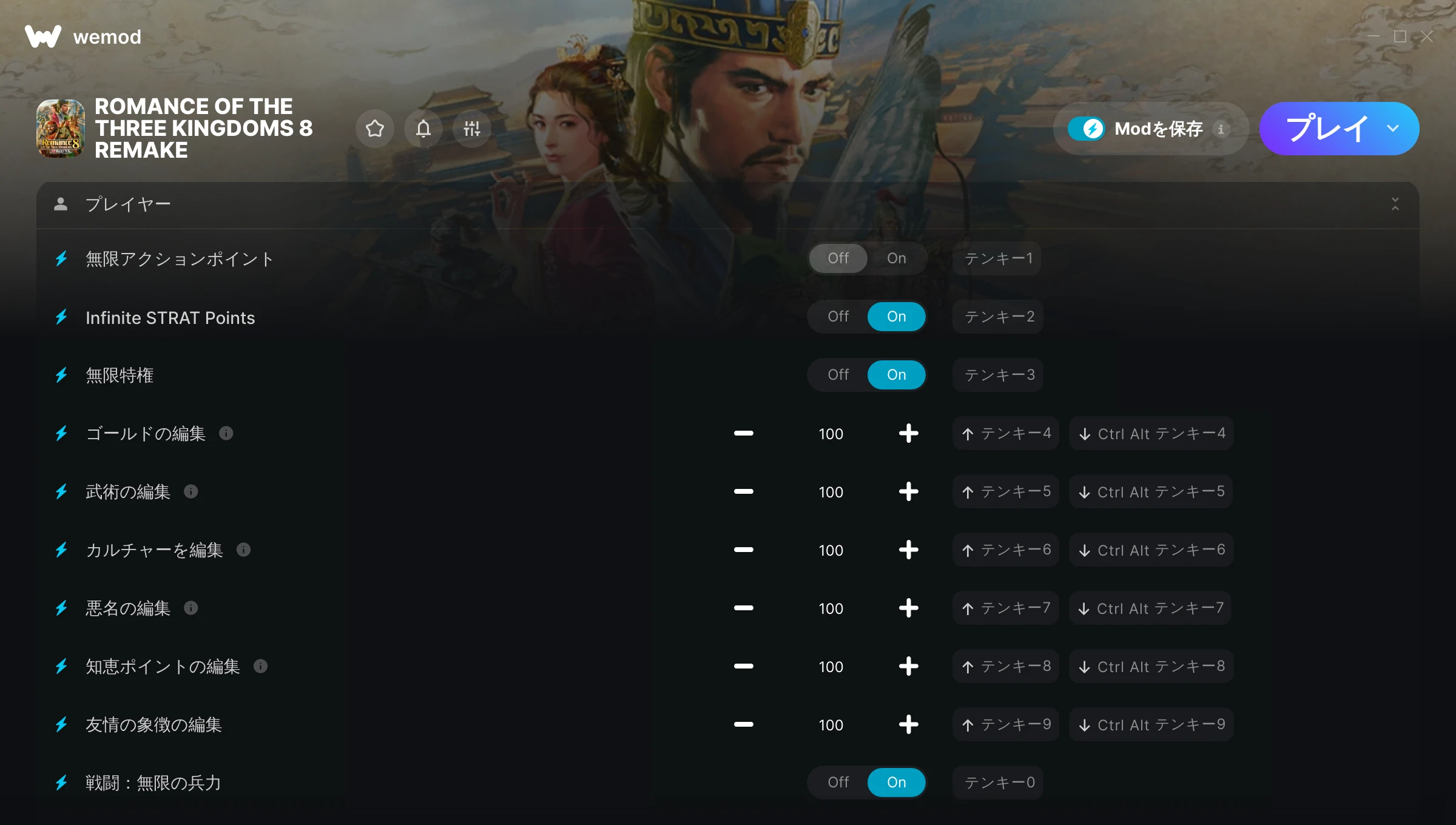 ROMANCE OF THE THREE KINGDOMS 8 REMAKEでチートを使うにはどうすればよいですか?WeModはすべてのゲームをPC上に安全に表現します。リストからゲームを開き、プレイを開始するだけです。ゲームが読み込まれ、ユーザーがゲーム内に入ると、さまざまなチートを有効化できるようになります!これは私のゲームのバージョンで動作しますか?WeModは高度な技術を使用して、実行中のゲームのバージョンを検知し、対応しているかどうかをユーザーに通知します。通知がなくても試してみることができますが、その場合はアップデートをリクエストしてみてください!