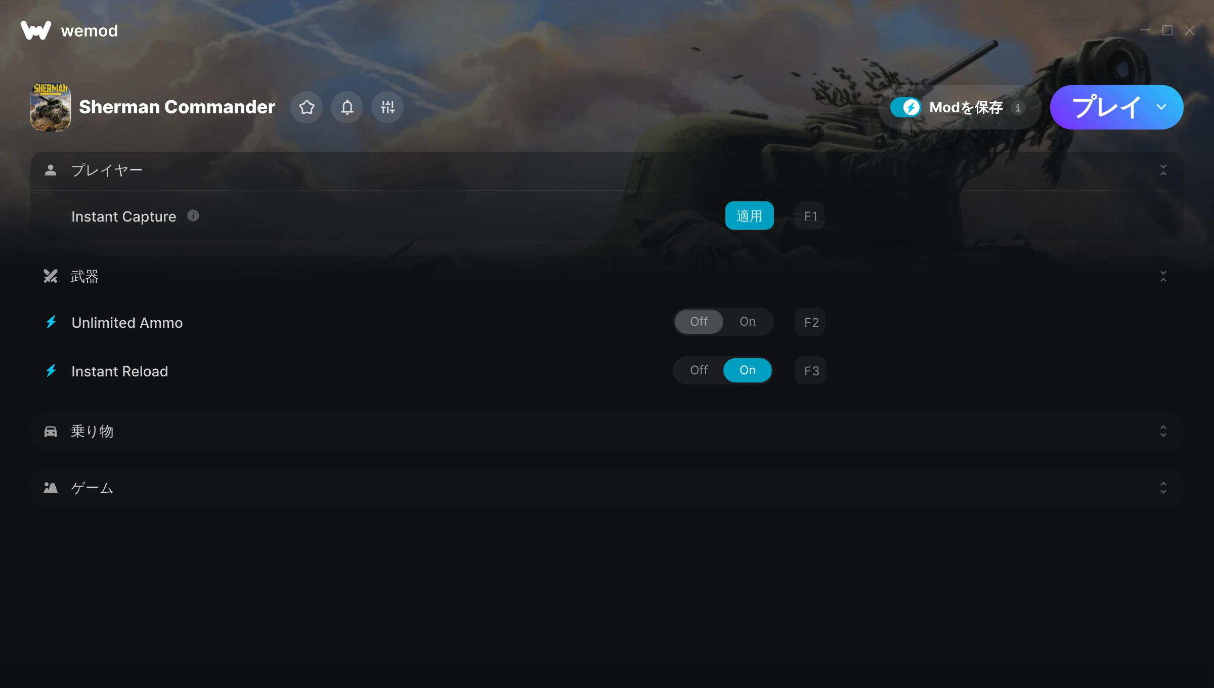 85MB Windows ...またはPCでWeModにアクセスしてアプリをダウンロード Instant Captureを入手, Unlimited Ammo & その他3件のMod for Sherman Commander with WeMod