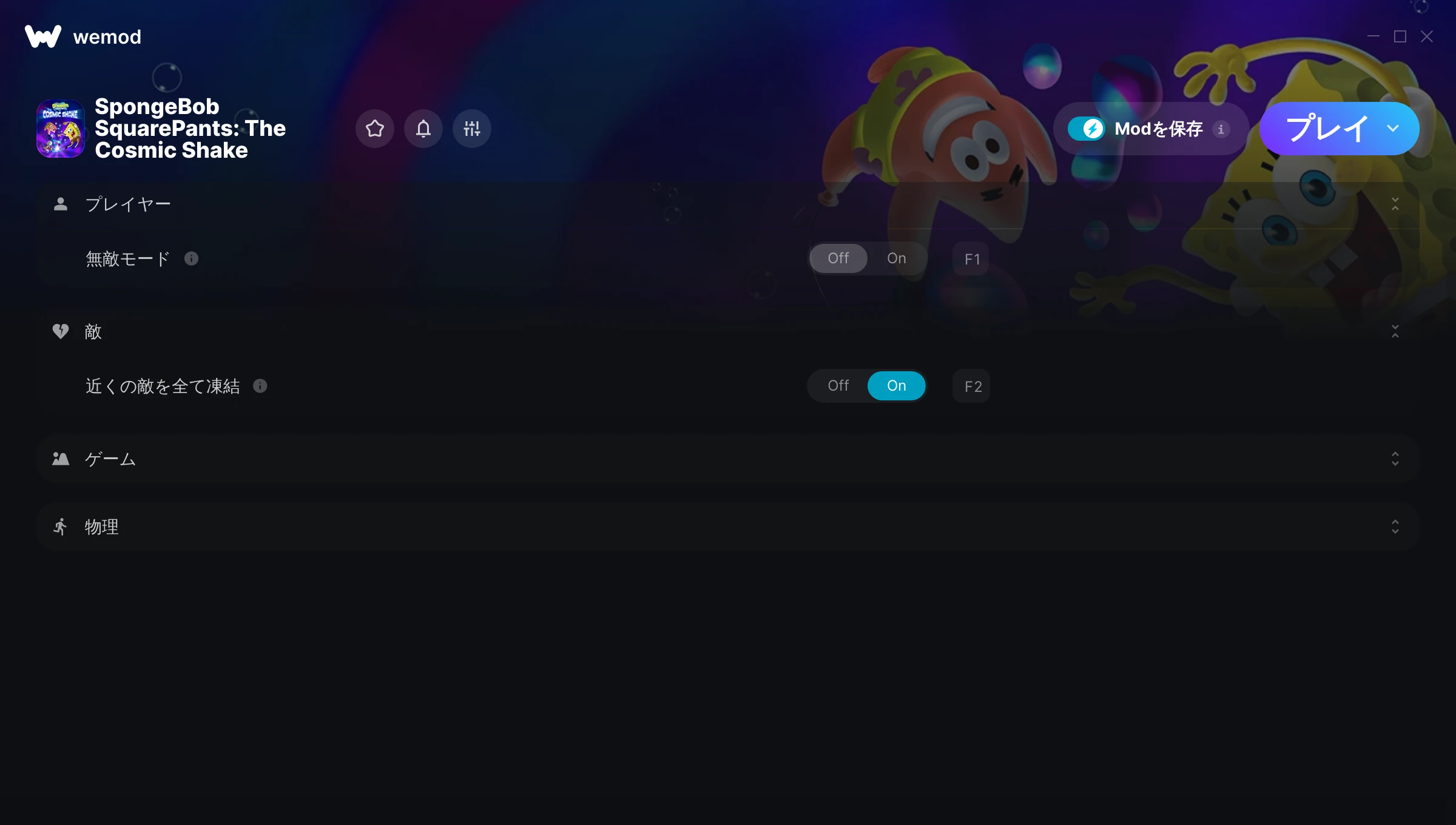 SpongeBob SquarePants: The Cosmic Shakeでチートを使うにはどうすればよいですか?WeModはすべてのゲームをPC上に安全に表現します。リストからゲームを開き、プレイを開始するだけです。ゲームが読み込まれ、ユーザーがゲーム内に入ると、さまざまなチートを有効化できるようになります!これは私のゲームのバージョンで動作しますか?WeModは高度な技術を使用して、実行中のゲームのバージョンを検知し、対応しているかどうかをユーザーに通知します。通知がなくても試してみることができますが、その場合はアップデートをリクエストしてみてください!