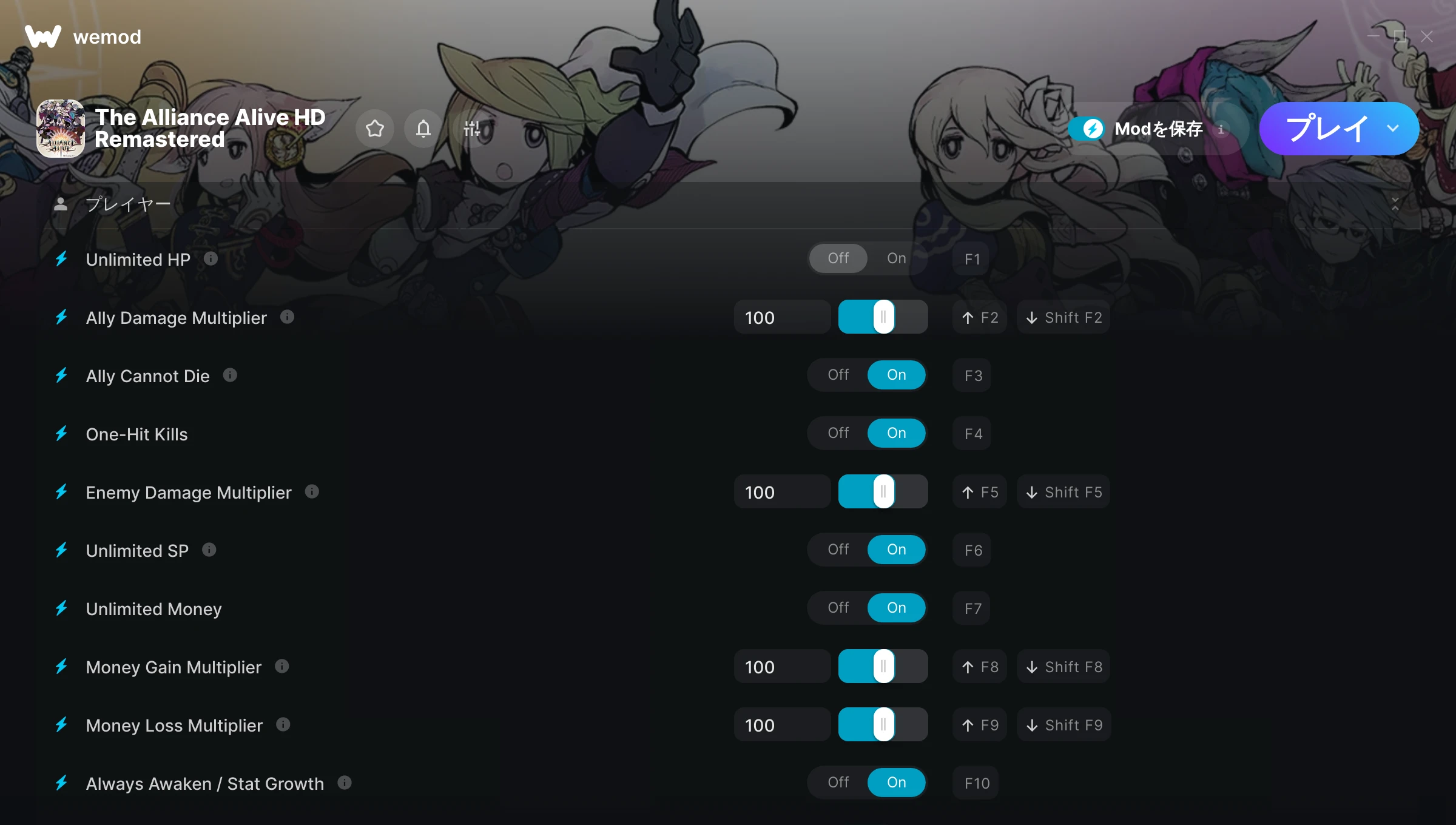 The Alliance Alive HD Remasteredでチートを使うにはどうすればよいですか?WeModはすべてのゲームをPC上に安全に表現します。リストからゲームを開き、プレイを開始するだけです。ゲームが読み込まれ、ユーザーがゲーム内に入ると、さまざまなチートを有効化できるようになります!これは私のゲームのバージョンで動作しますか?WeModは高度な技術を使用して、実行中のゲームのバージョンを検知し、対応しているかどうかをユーザーに通知します。通知がなくても試してみることができますが、その場合はアップデートをリクエストしてみてください!