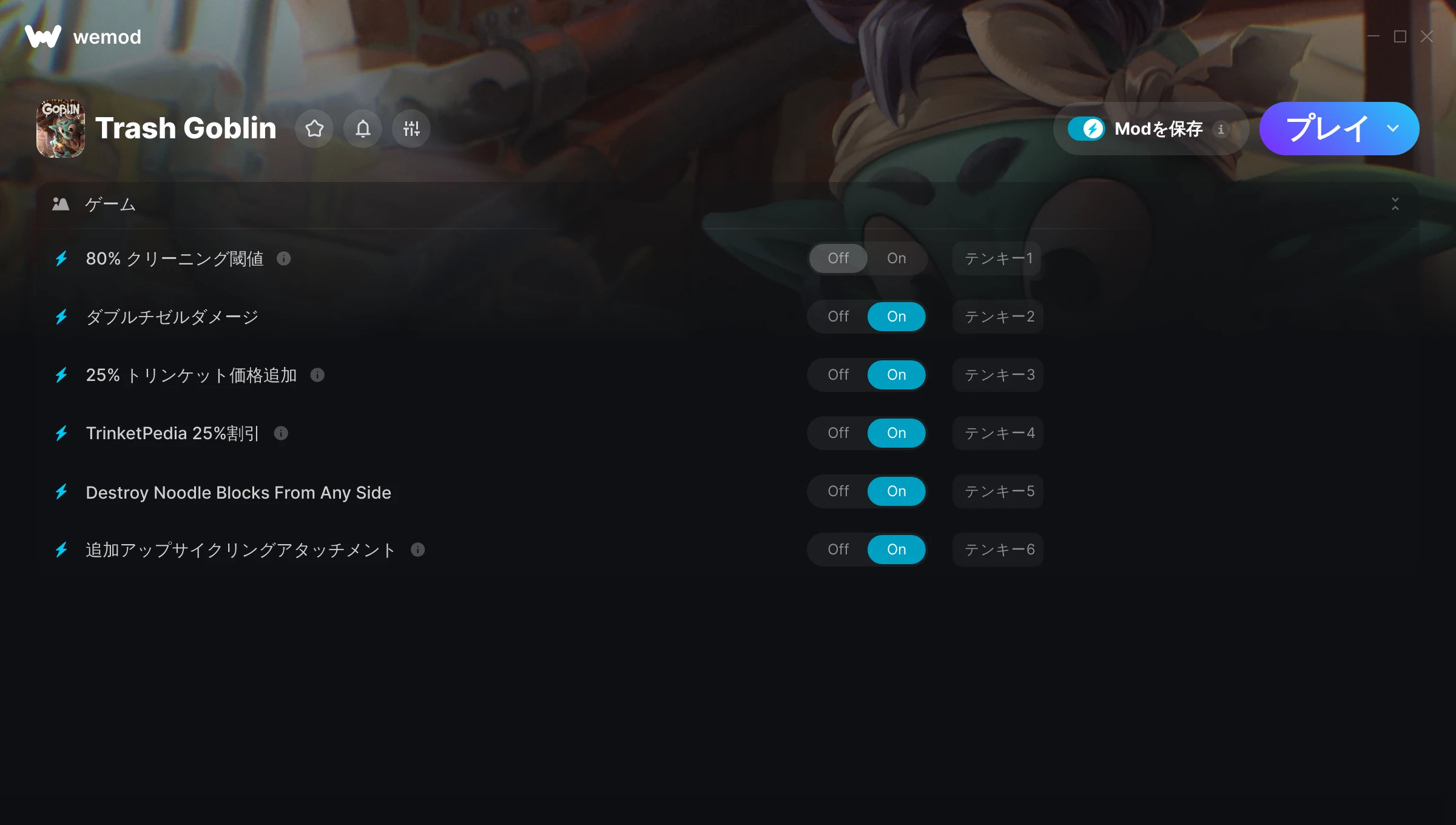 85MB Windows ...またはPCでWeModにアクセスしてアプリをダウンロード 80% クリーニング閾値を入手, ダブルチゼルダメージ & その他4件のMod for Trash Goblin with WeMod