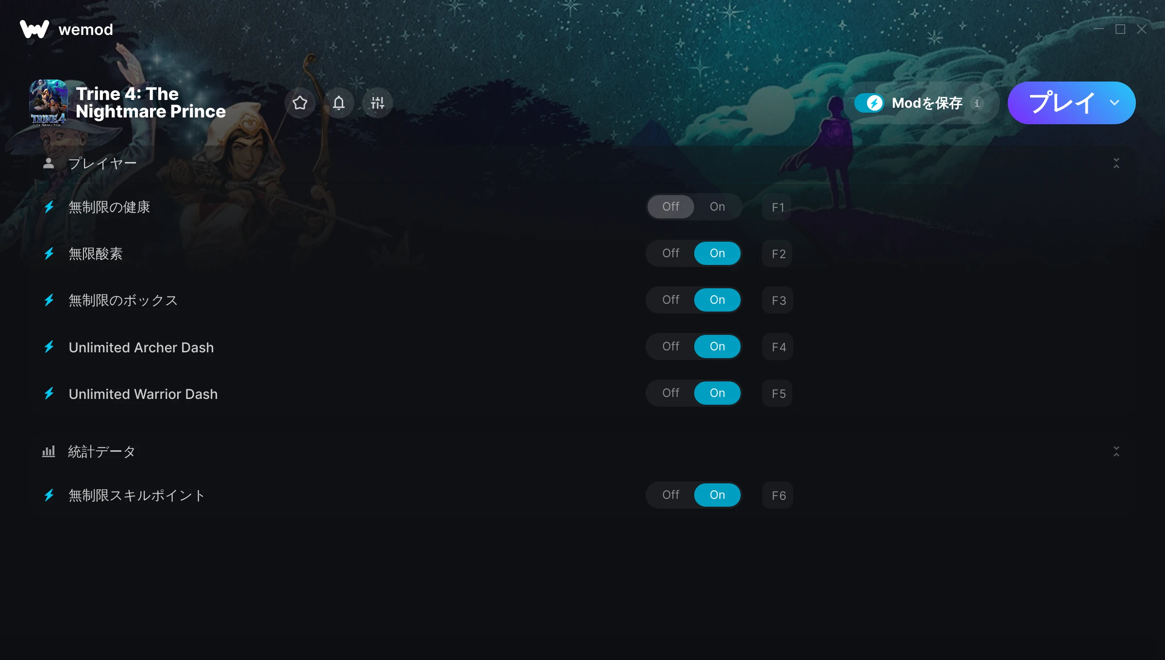 Trine 4: The Nightmare Princeでチートを使うにはどうすればよいですか?WeModはすべてのゲームをPC上に安全に表現します。リストからゲームを開き、プレイを開始するだけです。ゲームが読み込まれ、ユーザーがゲーム内に入ると、さまざまなチートを有効化できるようになります!これは私のゲームのバージョンで動作しますか?WeModは高度な技術を使用して、実行中のゲームのバージョンを検知し、対応しているかどうかをユーザーに通知します。通知がなくても試してみることができますが、その場合はアップデートをリクエストしてみてください!