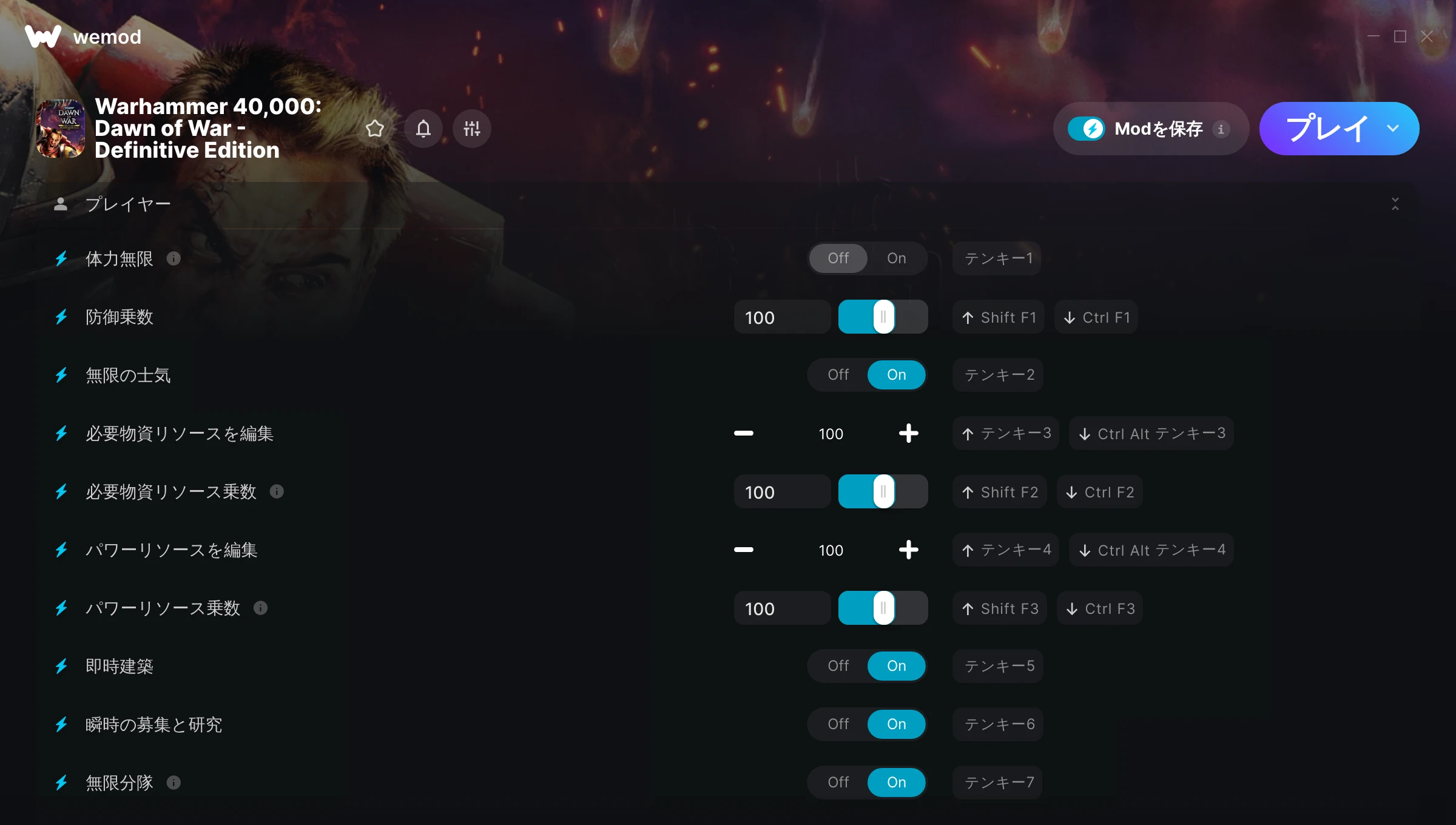 85MB Windows ...またはPCでWeModにアクセスしてアプリをダウンロード 体力無限を入手, 防御乗数 & その他18件のMod for Warhammer 40,000: Dawn of War - Definitive Edition with WeMod