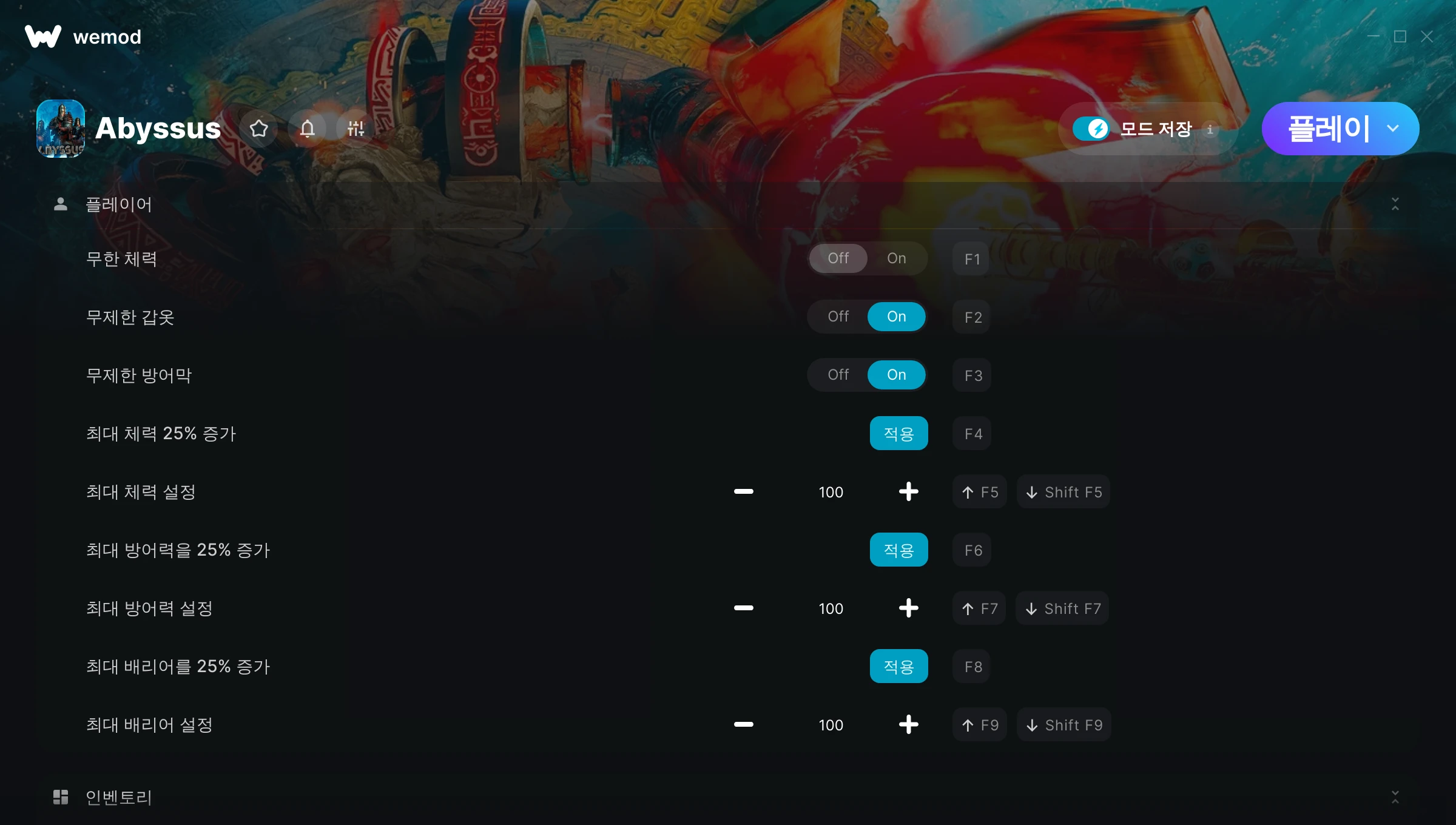Abyssus에서 치트를 사용하려면 어떻게 해야 하나요?WeMod는 PC의 모든 게임을 표시합니다. 목록에서 게임을 선택하고 플레이를 누르세요. 게임을 시작하면 다양한 치트를 활성화할 수 있습니다!모드가 제 게임 버전과 호환될까요?WeMod는 고급 기술로 실행 중인 게임 버전을 탐지하고 모드 지원 여부를 표시합니다. 모드가 지원되지 않는다면 모드를 테스트해보거나 업데이트를 요청할 수 있습니다!