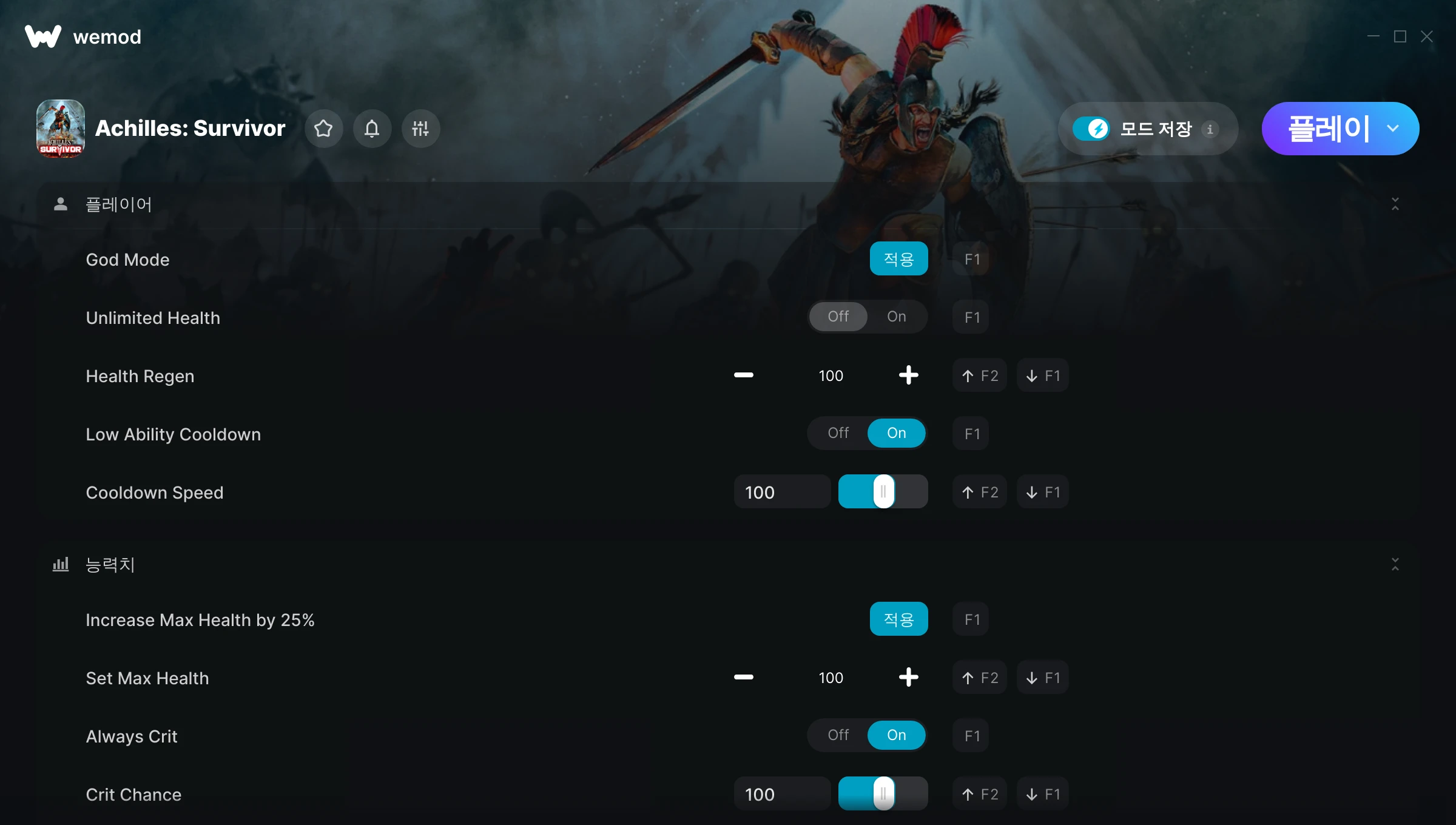 Achilles: Survivor에서 치트를 사용하려면 어떻게 해야 하나요?WeMod는 PC의 모든 게임을 표시합니다. 목록에서 게임을 선택하고 플레이를 누르세요. 게임을 시작하면 다양한 치트를 활성화할 수 있습니다!모드가 제 게임 버전과 호환될까요?WeMod는 고급 기술로 실행 중인 게임 버전을 탐지하고 모드 지원 여부를 표시합니다. 모드가 지원되지 않는다면 모드를 테스트해보거나 업데이트를 요청할 수 있습니다!