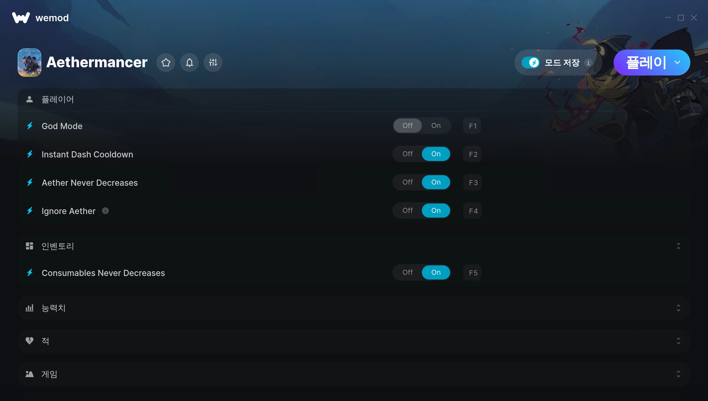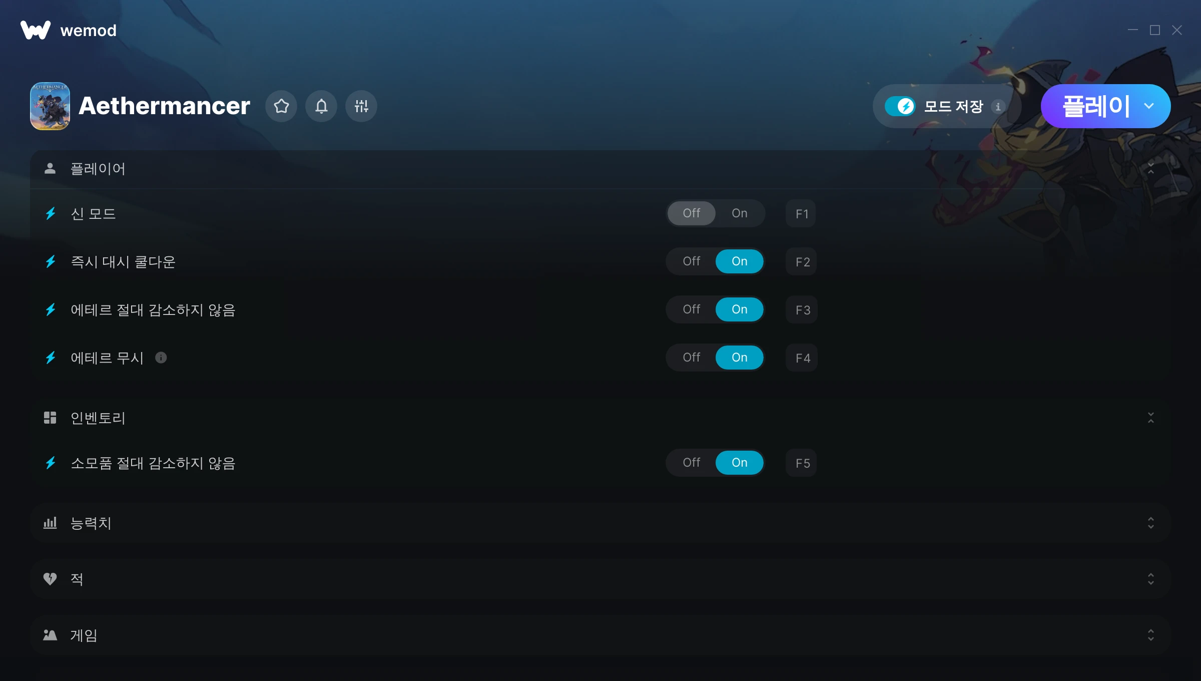 Aethermancer에서 치트를 사용하려면 어떻게 해야 하나요?WeMod는 PC의 모든 게임을 표시합니다. 목록에서 게임을 선택하고 플레이를 누르세요. 게임을 시작하면 다양한 치트를 활성화할 수 있습니다!모드가 제 게임 버전과 호환될까요?WeMod는 고급 기술로 실행 중인 게임 버전을 탐지하고 모드 지원 여부를 표시합니다. 모드가 지원되지 않는다면 모드를 테스트해보거나 업데이트를 요청할 수 있습니다!