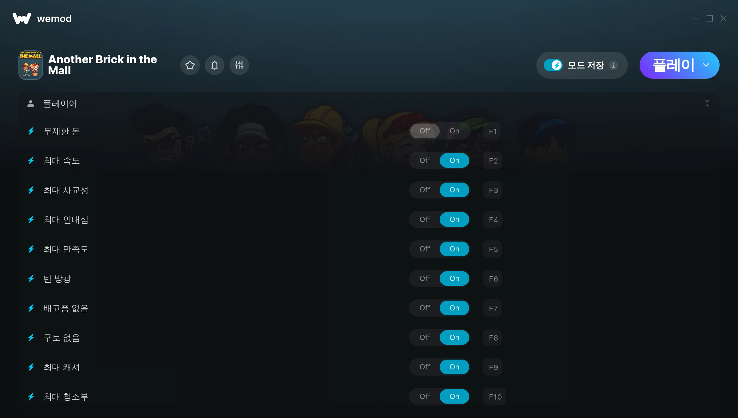 Another Brick in the Mall에서 치트를 사용하려면 어떻게 해야 하나요?WeMod는 PC의 모든 게임을 표시합니다. 목록에서 게임을 선택하고 플레이를 누르세요. 게임을 시작하면 다양한 치트를 활성화할 수 있습니다!모드가 제 게임 버전과 호환될까요?WeMod는 고급 기술로 실행 중인 게임 버전을 탐지하고 모드 지원 여부를 표시합니다. 모드가 지원되지 않는다면 모드를 테스트해보거나 업데이트를 요청할 수 있습니다!