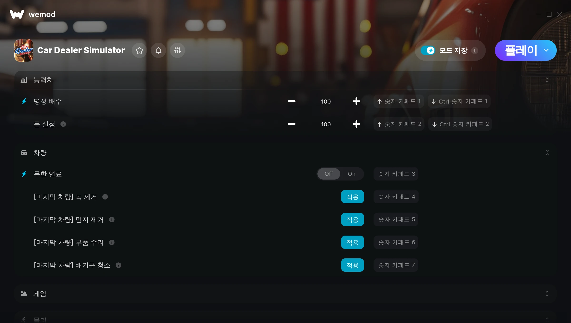Car Dealer Simulator에서 치트를 사용하려면 어떻게 해야 하나요?WeMod는 PC의 모든 게임을 표시합니다. 목록에서 게임을 선택하고 플레이를 누르세요. 게임을 시작하면 다양한 치트를 활성화할 수 있습니다!모드가 제 게임 버전과 호환될까요?WeMod는 고급 기술로 실행 중인 게임 버전을 탐지하고 모드 지원 여부를 표시합니다. 모드가 지원되지 않는다면 모드를 테스트해보거나 업데이트를 요청할 수 있습니다!