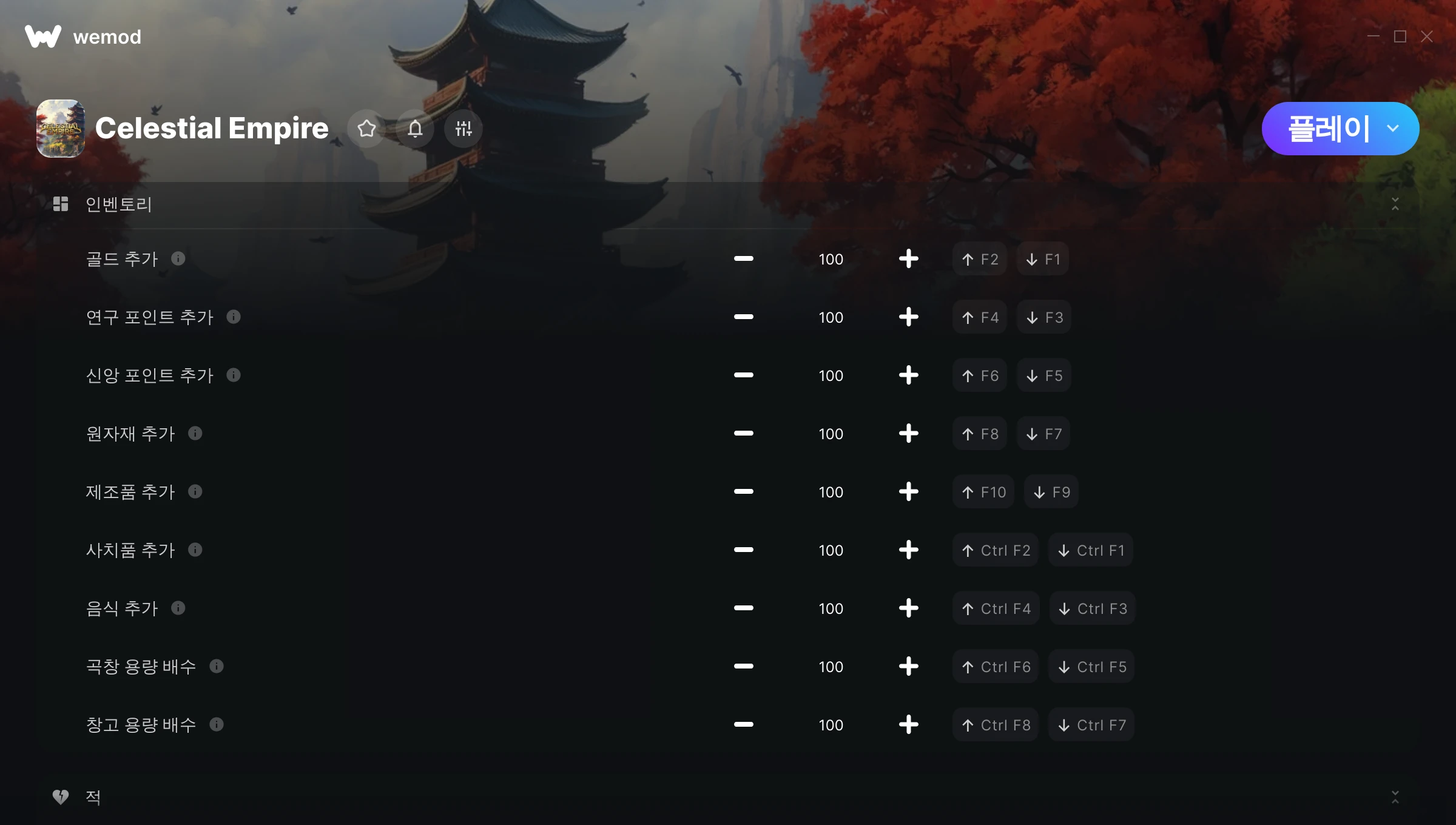 Celestial Empire에서 치트를 사용하려면 어떻게 해야 하나요?WeMod는 PC의 모든 게임을 표시합니다. 목록에서 게임을 선택하고 플레이를 누르세요. 게임을 시작하면 다양한 치트를 활성화할 수 있습니다!모드가 제 게임 버전과 호환될까요?WeMod는 고급 기술로 실행 중인 게임 버전을 탐지하고 모드 지원 여부를 표시합니다. 모드가 지원되지 않는다면 모드를 테스트해보거나 업데이트를 요청할 수 있습니다!