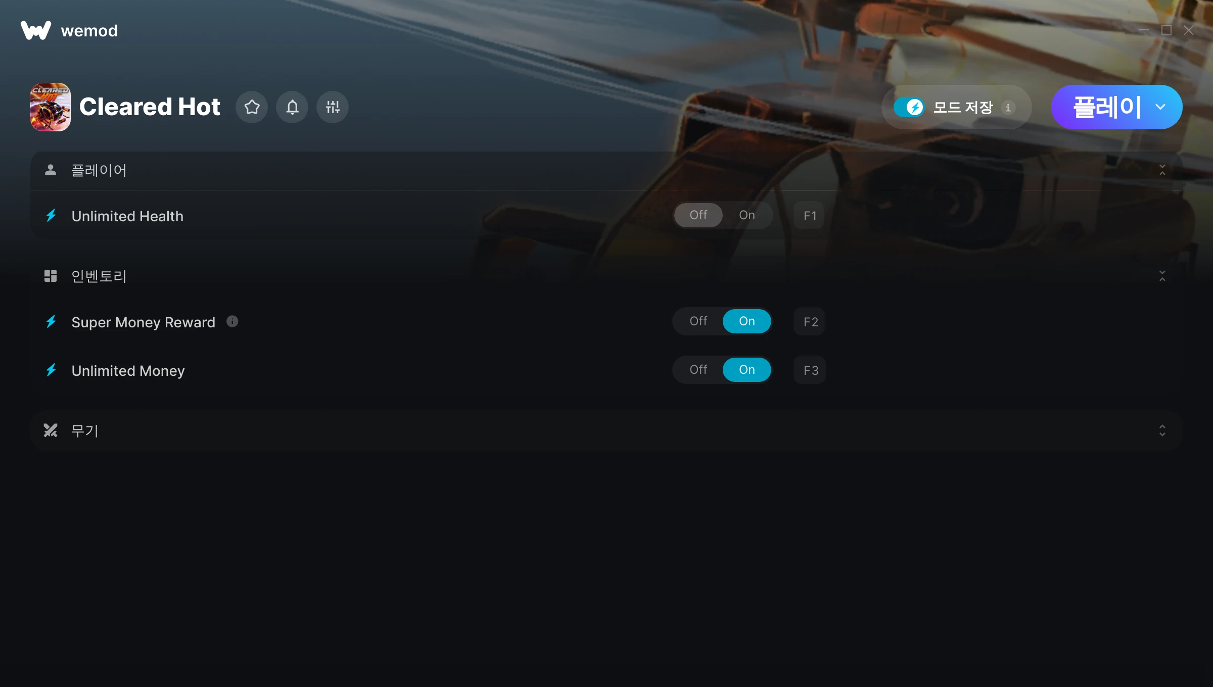 Cleared Hot에서 치트를 사용하려면 어떻게 해야 하나요?WeMod는 PC의 모든 게임을 표시합니다. 목록에서 게임을 선택하고 플레이를 누르세요. 게임을 시작하면 다양한 치트를 활성화할 수 있습니다!모드가 제 게임 버전과 호환될까요?WeMod는 고급 기술로 실행 중인 게임 버전을 탐지하고 모드 지원 여부를 표시합니다. 모드가 지원되지 않는다면 모드를 테스트해보거나 업데이트를 요청할 수 있습니다!