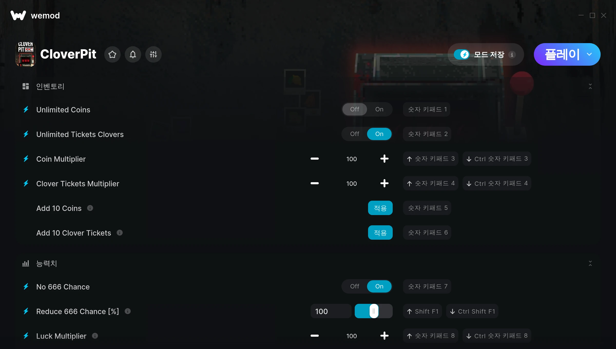 CloverPit에서 치트를 사용하려면 어떻게 해야 하나요?WeMod는 PC의 모든 게임을 표시합니다. 목록에서 게임을 선택하고 플레이를 누르세요. 게임을 시작하면 다양한 치트를 활성화할 수 있습니다!모드가 제 게임 버전과 호환될까요?WeMod는 고급 기술로 실행 중인 게임 버전을 탐지하고 모드 지원 여부를 표시합니다. 모드가 지원되지 않는다면 모드를 테스트해보거나 업데이트를 요청할 수 있습니다!