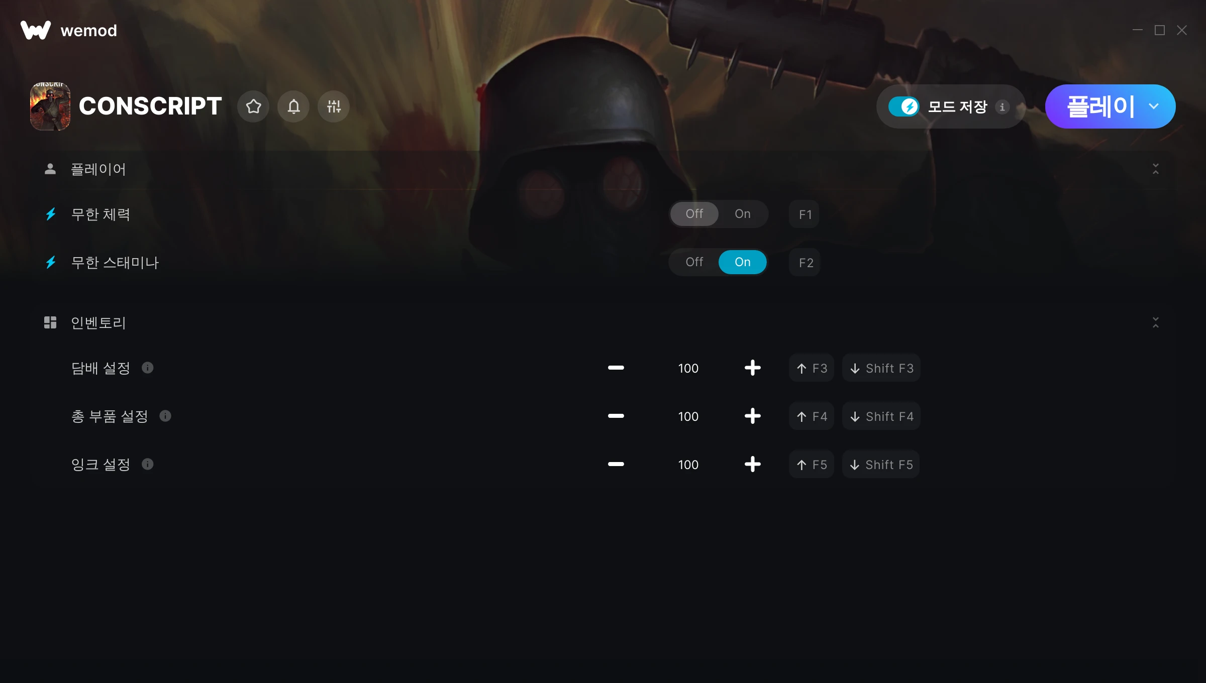 CONSCRIPT에서 치트를 사용하려면 어떻게 해야 하나요?WeMod는 PC의 모든 게임을 표시합니다. 목록에서 게임을 선택하고 플레이를 누르세요. 게임을 시작하면 다양한 치트를 활성화할 수 있습니다!모드가 제 게임 버전과 호환될까요?WeMod는 고급 기술로 실행 중인 게임 버전을 탐지하고 모드 지원 여부를 표시합니다. 모드가 지원되지 않는다면 모드를 테스트해보거나 업데이트를 요청할 수 있습니다!