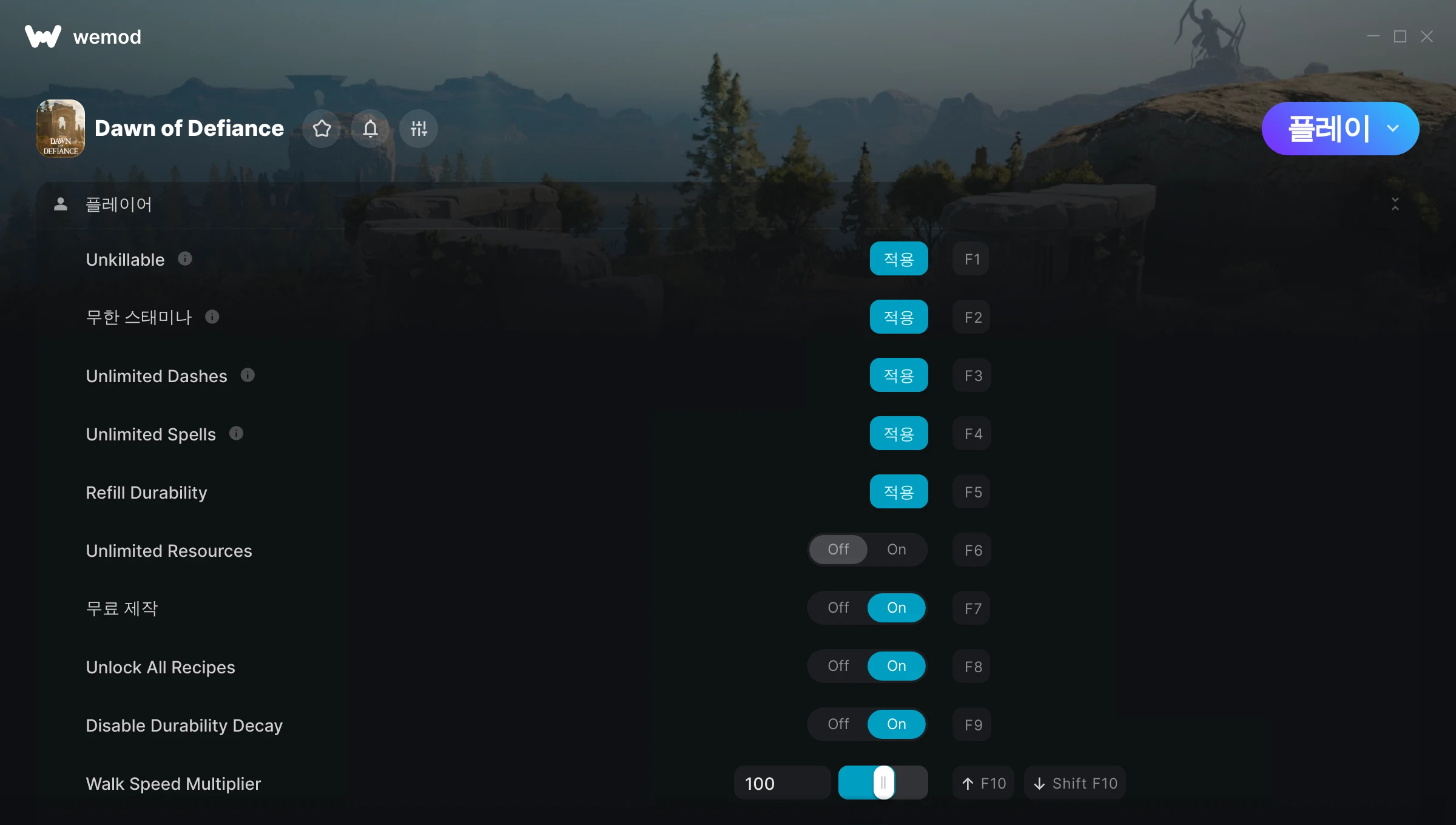 Dawn of Defiance에서 치트를 사용하려면 어떻게 해야 하나요?WeMod는 PC의 모든 게임을 표시합니다. 목록에서 게임을 선택하고 플레이를 누르세요. 게임을 시작하면 다양한 치트를 활성화할 수 있습니다!모드가 제 게임 버전과 호환될까요?WeMod는 고급 기술로 실행 중인 게임 버전을 탐지하고 모드 지원 여부를 표시합니다. 모드가 지원되지 않는다면 모드를 테스트해보거나 업데이트를 요청할 수 있습니다!