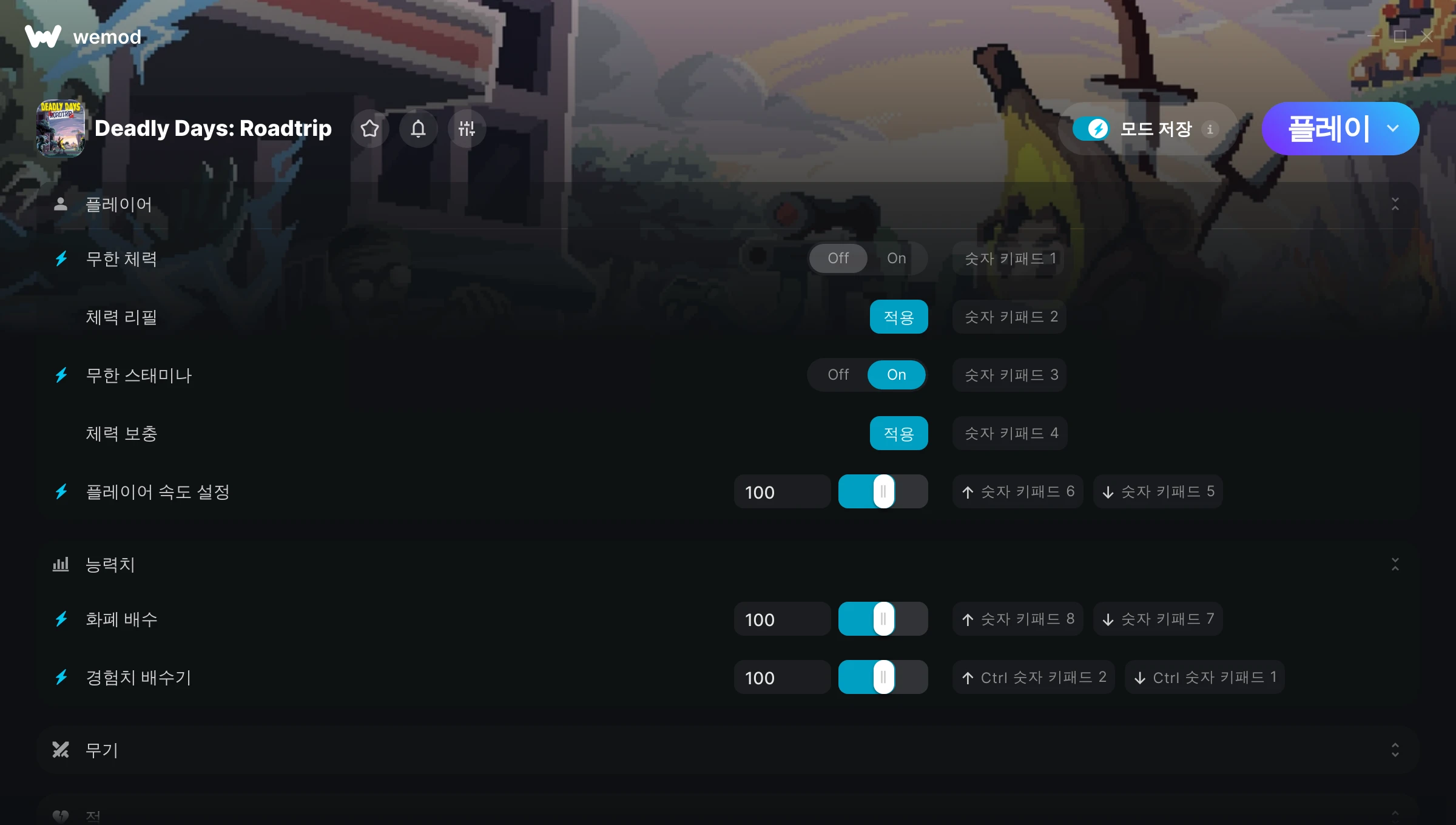 Deadly Days: Roadtrip에서 치트를 사용하려면 어떻게 해야 하나요?WeMod는 PC의 모든 게임을 표시합니다. 목록에서 게임을 선택하고 플레이를 누르세요. 게임을 시작하면 다양한 치트를 활성화할 수 있습니다!모드가 제 게임 버전과 호환될까요?WeMod는 고급 기술로 실행 중인 게임 버전을 탐지하고 모드 지원 여부를 표시합니다. 모드가 지원되지 않는다면 모드를 테스트해보거나 업데이트를 요청할 수 있습니다!