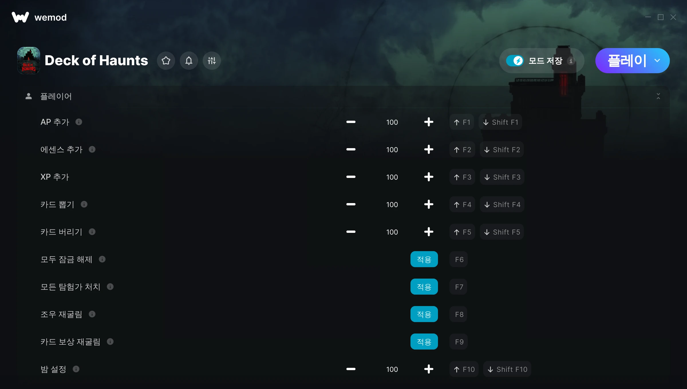 Deck of Haunts에서 치트를 사용하려면 어떻게 해야 하나요?WeMod는 PC의 모든 게임을 표시합니다. 목록에서 게임을 선택하고 플레이를 누르세요. 게임을 시작하면 다양한 치트를 활성화할 수 있습니다!모드가 제 게임 버전과 호환될까요?WeMod는 고급 기술로 실행 중인 게임 버전을 탐지하고 모드 지원 여부를 표시합니다. 모드가 지원되지 않는다면 모드를 테스트해보거나 업데이트를 요청할 수 있습니다!