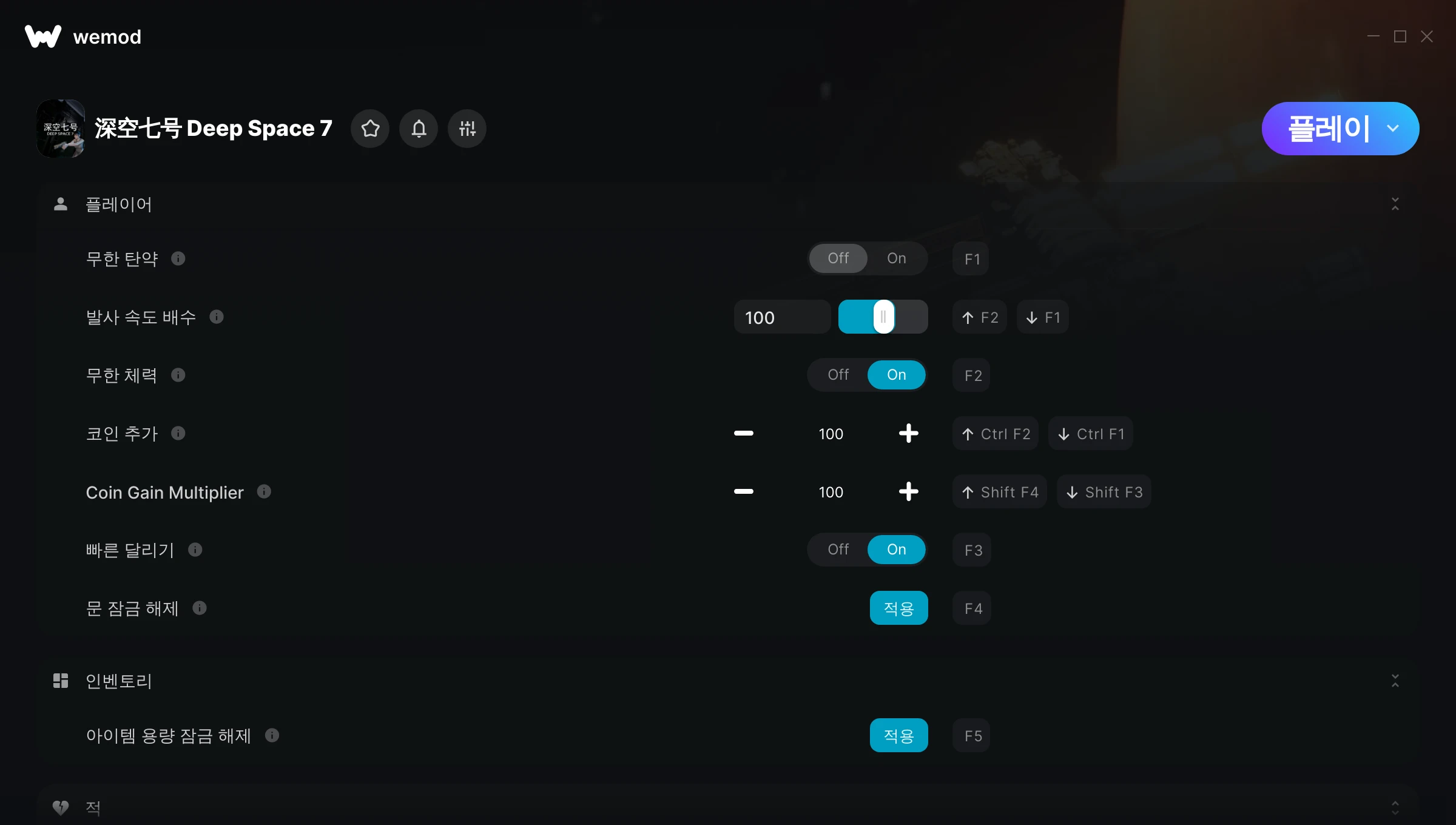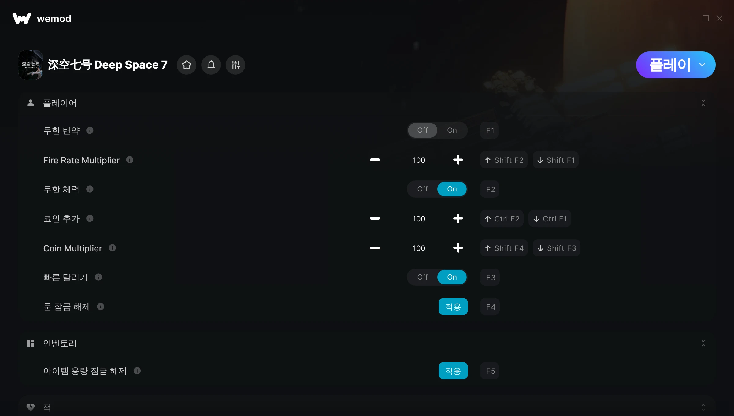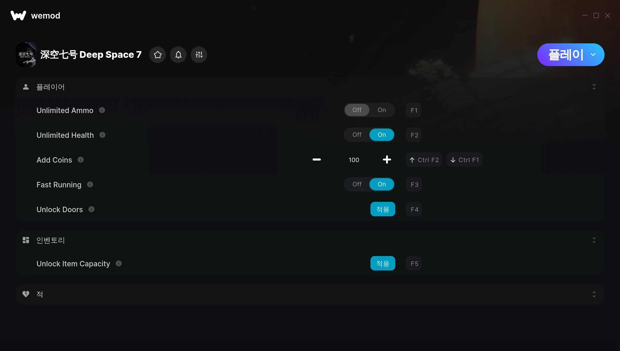 深空七号 Deep Space 7에서 치트를 사용하려면 어떻게 해야 하나요?WeMod는 PC의 모든 게임을 표시합니다. 목록에서 게임을 선택하고 플레이를 누르세요. 게임을 시작하면 다양한 치트를 활성화할 수 있습니다!모드가 제 게임 버전과 호환될까요?WeMod는 고급 기술로 실행 중인 게임 버전을 탐지하고 모드 지원 여부를 표시합니다. 모드가 지원되지 않는다면 모드를 테스트해보거나 업데이트를 요청할 수 있습니다!