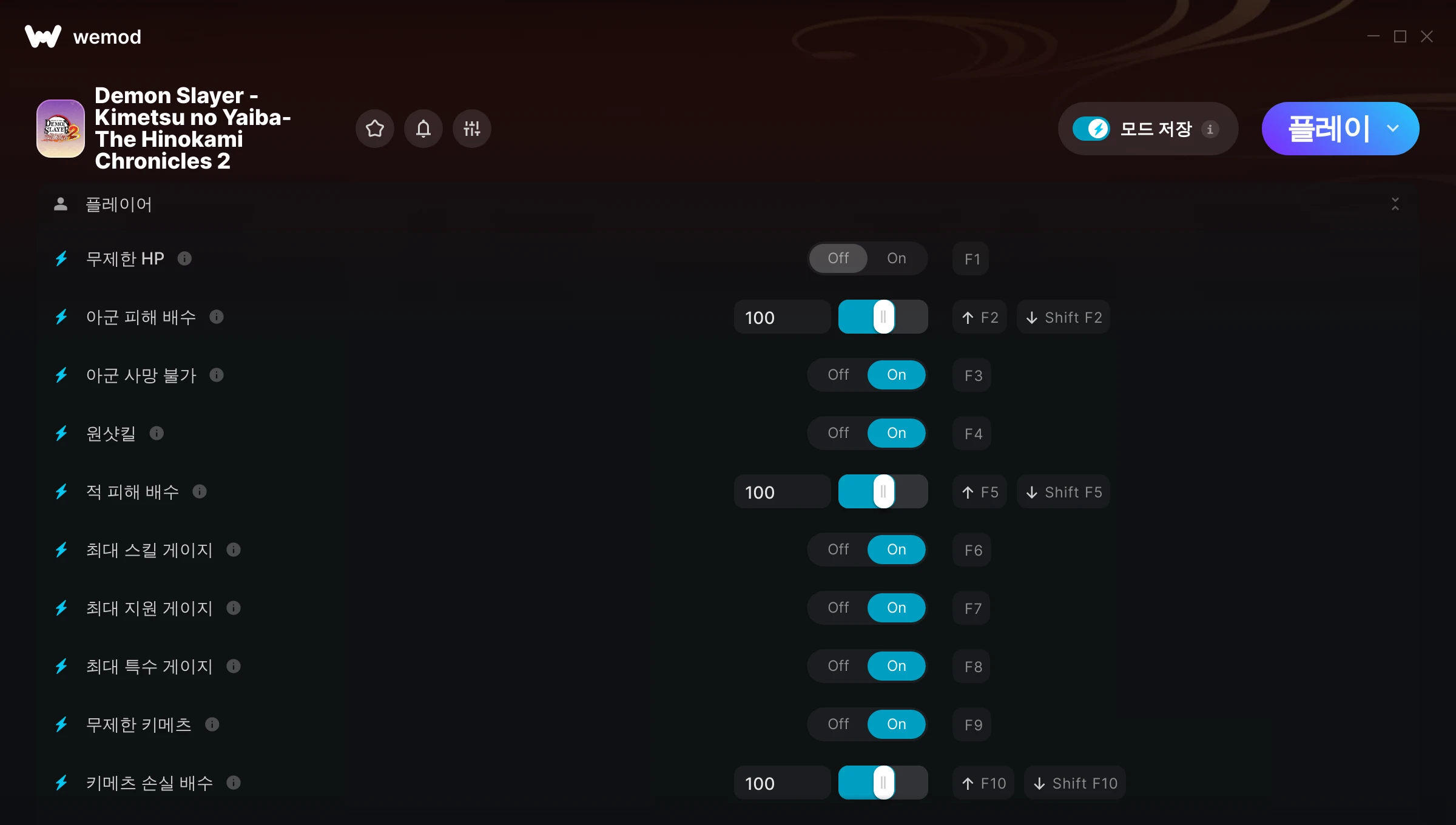 Demon Slayer -Kimetsu no Yaiba- The Hinokami Chronicles 2에서 치트를 사용하려면 어떻게 해야 하나요?WeMod는 PC의 모든 게임을 표시합니다. 목록에서 게임을 선택하고 플레이를 누르세요. 게임을 시작하면 다양한 치트를 활성화할 수 있습니다!모드가 제 게임 버전과 호환될까요?WeMod는 고급 기술로 실행 중인 게임 버전을 탐지하고 모드 지원 여부를 표시합니다. 모드가 지원되지 않는다면 모드를 테스트해보거나 업데이트를 요청할 수 있습니다!