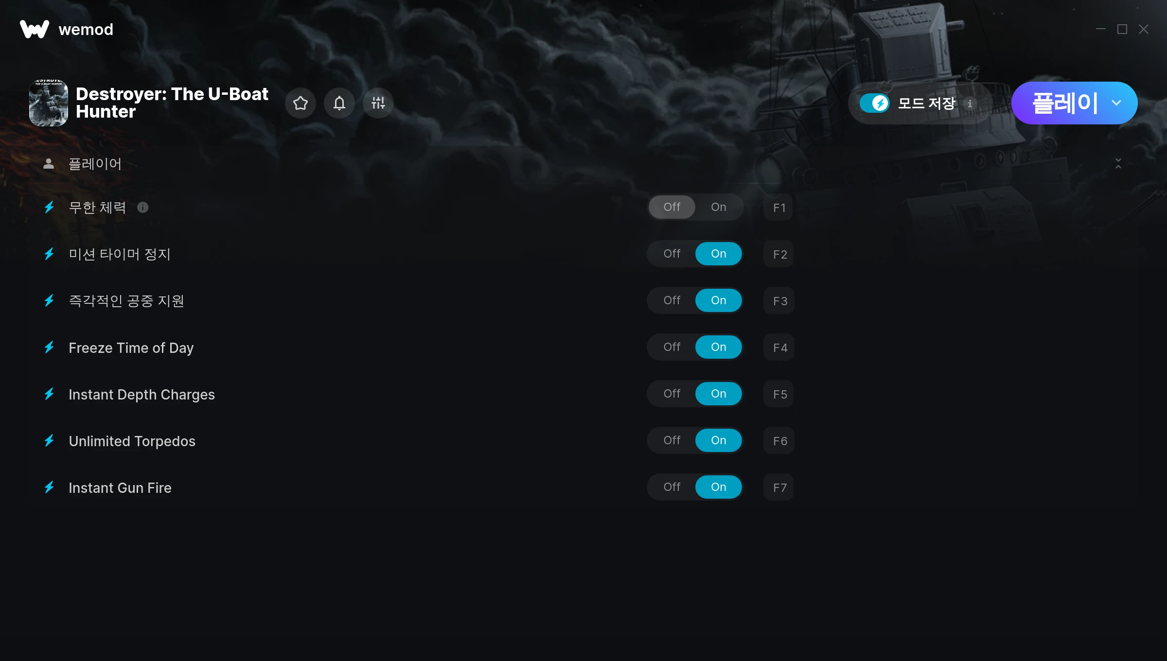 Destroyer: The U-Boat Hunter에서 치트를 사용하려면 어떻게 해야 하나요?WeMod는 PC의 모든 게임을 표시합니다. 목록에서 게임을 선택하고 플레이를 누르세요. 게임을 시작하면 다양한 치트를 활성화할 수 있습니다!모드가 제 게임 버전과 호환될까요?WeMod는 고급 기술로 실행 중인 게임 버전을 탐지하고 모드 지원 여부를 표시합니다. 모드가 지원되지 않는다면 모드를 테스트해보거나 업데이트를 요청할 수 있습니다!