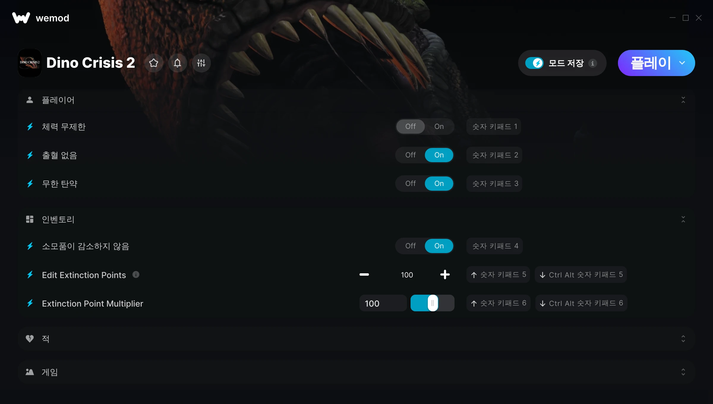 Dino Crisis 2에서 치트를 사용하려면 어떻게 해야 하나요?WeMod는 PC의 모든 게임을 표시합니다. 목록에서 게임을 선택하고 플레이를 누르세요. 게임을 시작하면 다양한 치트를 활성화할 수 있습니다!모드가 제 게임 버전과 호환될까요?WeMod는 고급 기술로 실행 중인 게임 버전을 탐지하고 모드 지원 여부를 표시합니다. 모드가 지원되지 않는다면 모드를 테스트해보거나 업데이트를 요청할 수 있습니다!