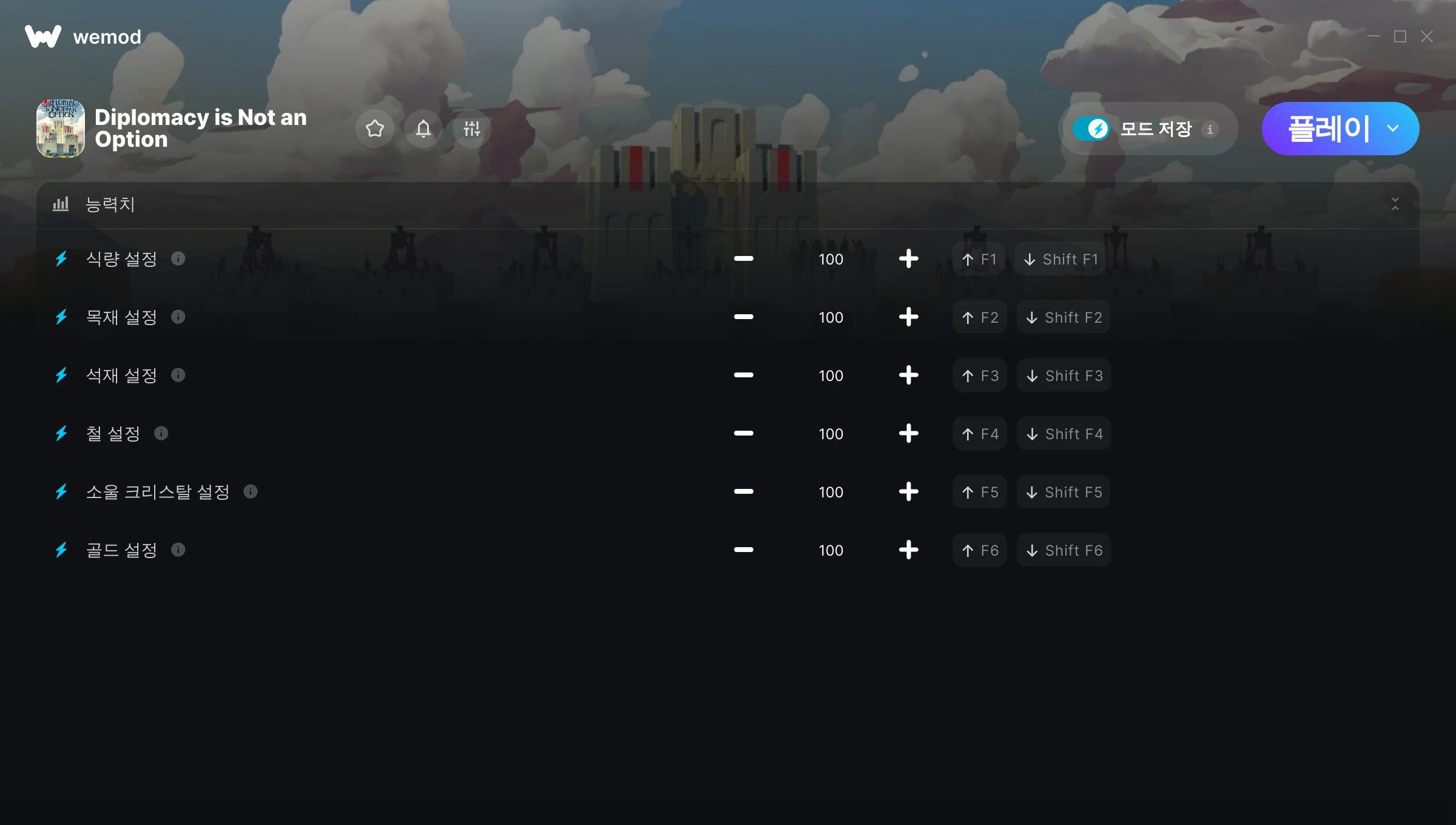 85MB Windows ...또는 PC에서 WeMod를 방문해 앱을 다운로드할 수도 있습니다 식량 설정 받기, 목재 설정 & 4개의 다른 모드 for Diplomacy is Not an Option with WeMod
