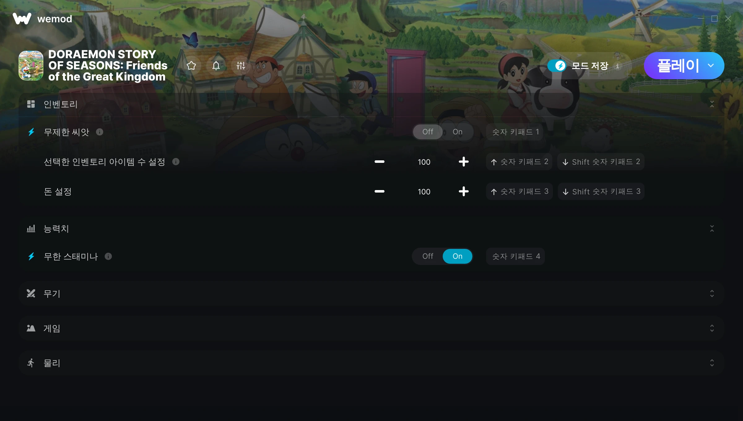 DORAEMON STORY OF SEASONS: Friends of the Great Kingdom에서 치트를 사용하려면 어떻게 해야 하나요?WeMod는 PC의 모든 게임을 표시합니다. 목록에서 게임을 선택하고 플레이를 누르세요. 게임을 시작하면 다양한 치트를 활성화할 수 있습니다!모드가 제 게임 버전과 호환될까요?WeMod는 고급 기술로 실행 중인 게임 버전을 탐지하고 모드 지원 여부를 표시합니다. 모드가 지원되지 않는다면 모드를 테스트해보거나 업데이트를 요청할 수 있습니다!