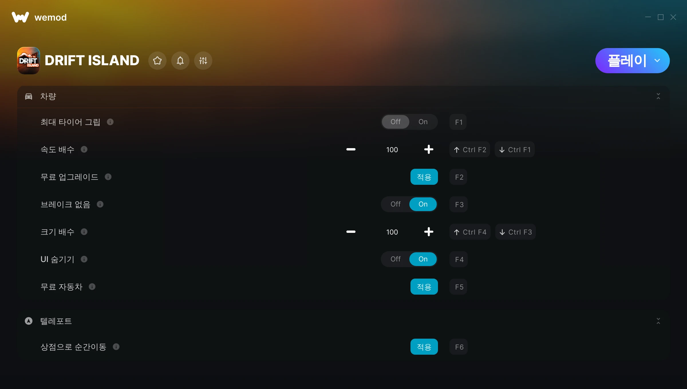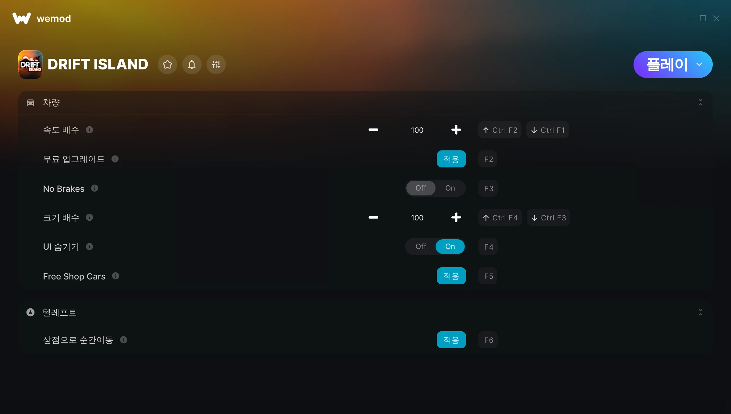 DRIFT ISLAND에서 치트를 사용하려면 어떻게 해야 하나요?WeMod는 PC의 모든 게임을 표시합니다. 목록에서 게임을 선택하고 플레이를 누르세요. 게임을 시작하면 다양한 치트를 활성화할 수 있습니다!모드가 제 게임 버전과 호환될까요?WeMod는 고급 기술로 실행 중인 게임 버전을 탐지하고 모드 지원 여부를 표시합니다. 모드가 지원되지 않는다면 모드를 테스트해보거나 업데이트를 요청할 수 있습니다!