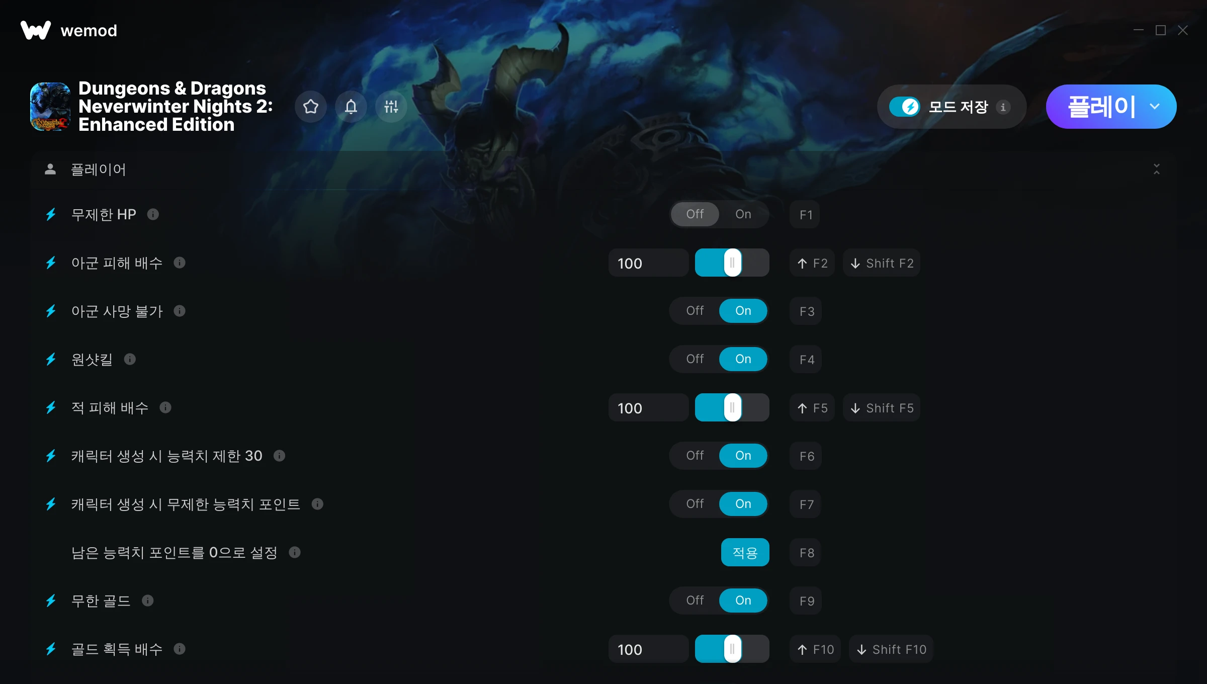 Dungeons & Dragons Neverwinter Nights 2: Enhanced Edition에서 치트를 사용하려면 어떻게 해야 하나요?WeMod는 PC의 모든 게임을 표시합니다. 목록에서 게임을 선택하고 플레이를 누르세요. 게임을 시작하면 다양한 치트를 활성화할 수 있습니다!모드가 제 게임 버전과 호환될까요?WeMod는 고급 기술로 실행 중인 게임 버전을 탐지하고 모드 지원 여부를 표시합니다. 모드가 지원되지 않는다면 모드를 테스트해보거나 업데이트를 요청할 수 있습니다!