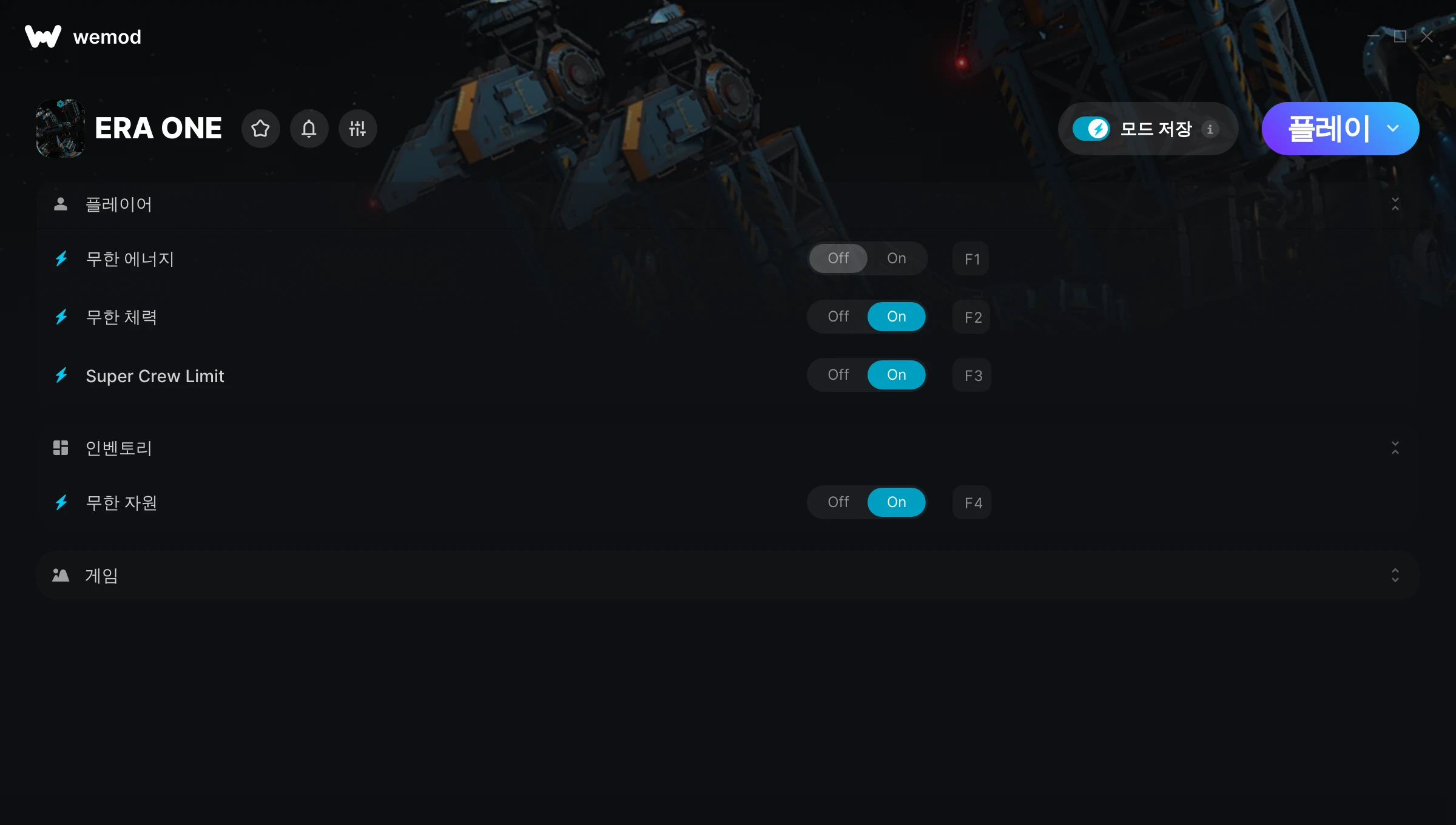 ERA ONE에서 치트를 사용하려면 어떻게 해야 하나요?WeMod는 PC의 모든 게임을 표시합니다. 목록에서 게임을 선택하고 플레이를 누르세요. 게임을 시작하면 다양한 치트를 활성화할 수 있습니다!모드가 제 게임 버전과 호환될까요?WeMod는 고급 기술로 실행 중인 게임 버전을 탐지하고 모드 지원 여부를 표시합니다. 모드가 지원되지 않는다면 모드를 테스트해보거나 업데이트를 요청할 수 있습니다!