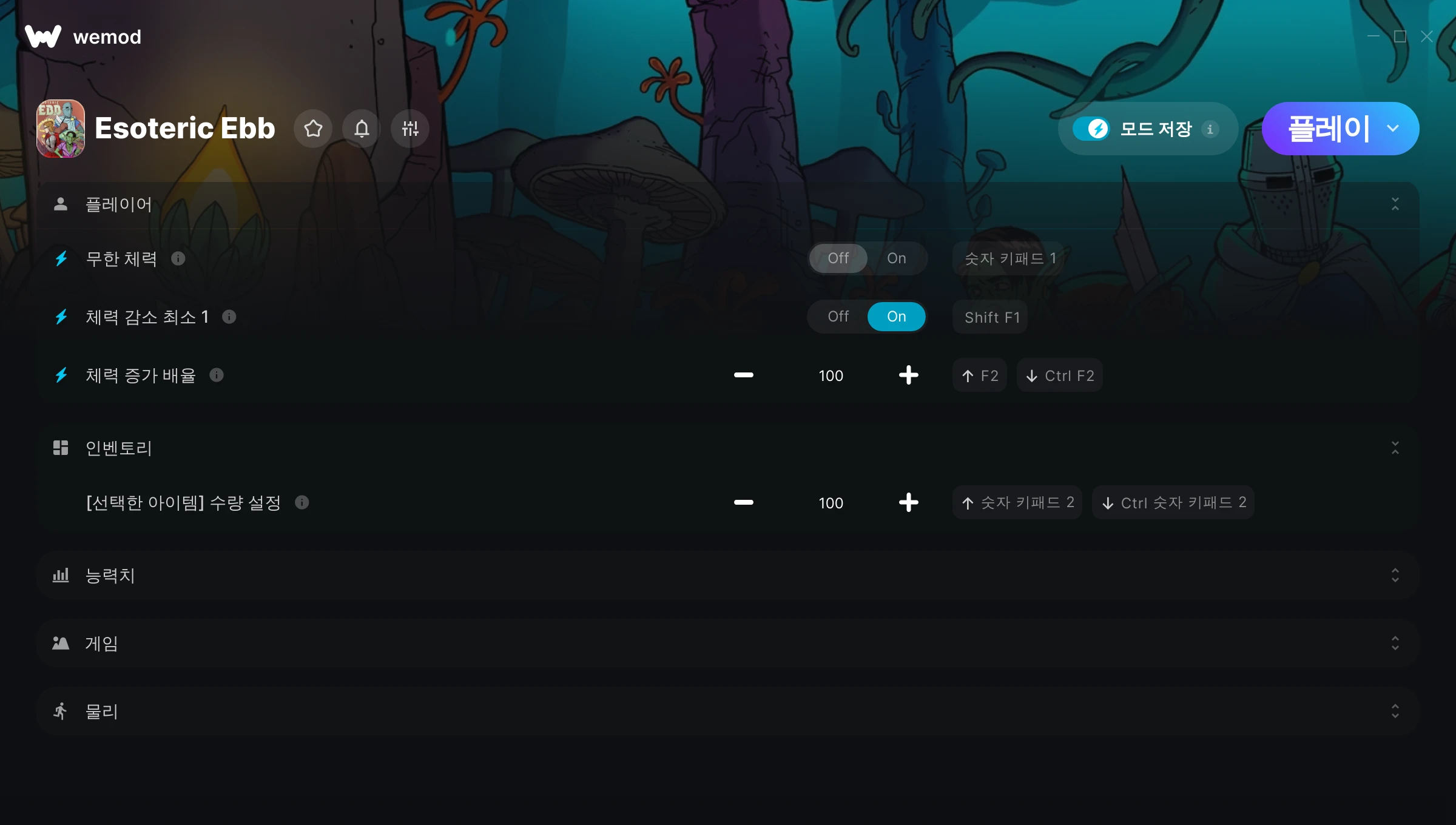 Esoteric Ebb에서 치트를 사용하려면 어떻게 해야 하나요?WeMod는 PC의 모든 게임을 표시합니다. 목록에서 게임을 선택하고 플레이를 누르세요. 게임을 시작하면 다양한 치트를 활성화할 수 있습니다!모드가 제 게임 버전과 호환될까요?WeMod는 고급 기술로 실행 중인 게임 버전을 탐지하고 모드 지원 여부를 표시합니다. 모드가 지원되지 않는다면 모드를 테스트해보거나 업데이트를 요청할 수 있습니다!