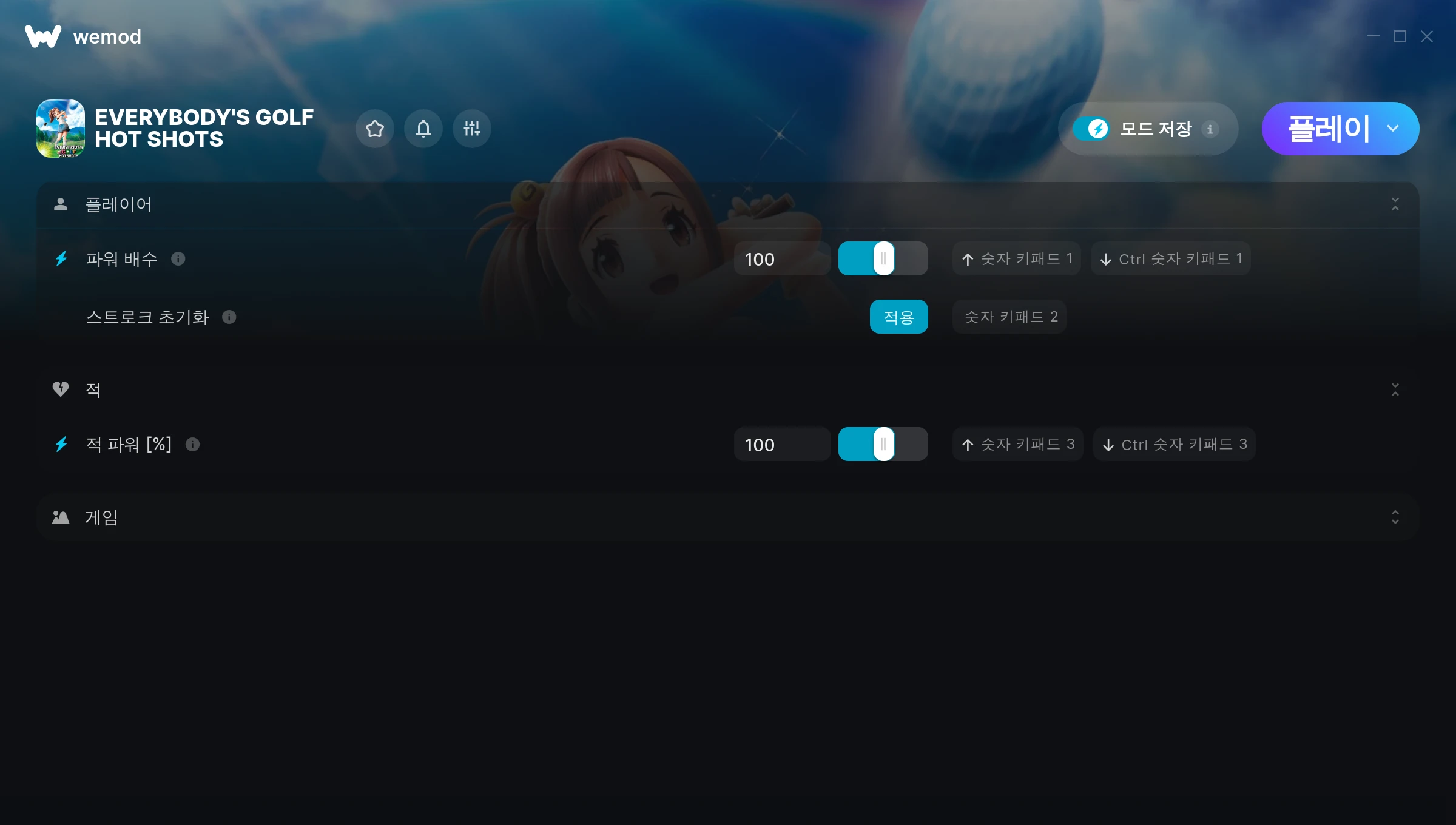 EVERYBODY'S GOLF HOT SHOTS에서 치트를 사용하려면 어떻게 해야 하나요?WeMod는 PC의 모든 게임을 표시합니다. 목록에서 게임을 선택하고 플레이를 누르세요. 게임을 시작하면 다양한 치트를 활성화할 수 있습니다!모드가 제 게임 버전과 호환될까요?WeMod는 고급 기술로 실행 중인 게임 버전을 탐지하고 모드 지원 여부를 표시합니다. 모드가 지원되지 않는다면 모드를 테스트해보거나 업데이트를 요청할 수 있습니다!